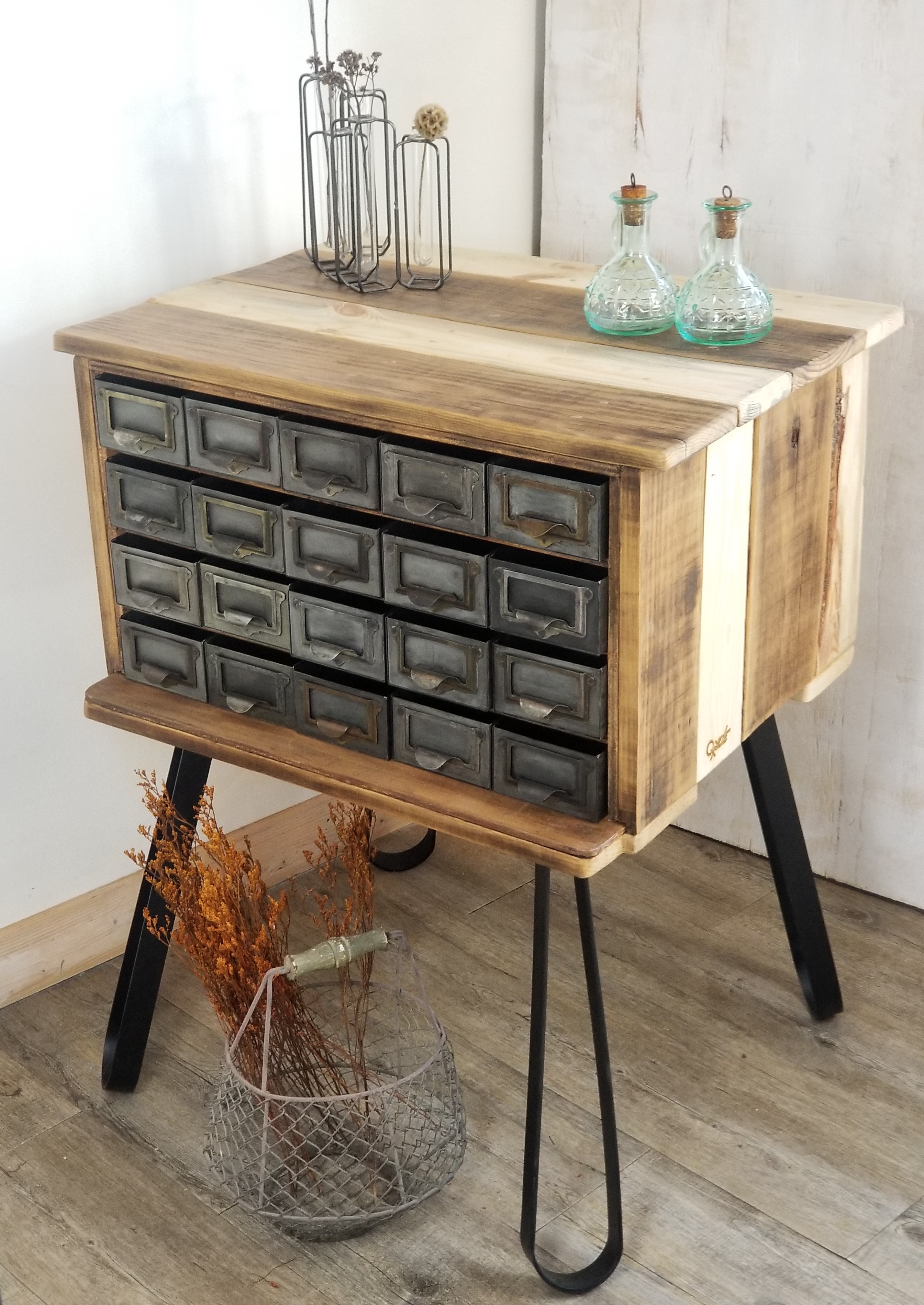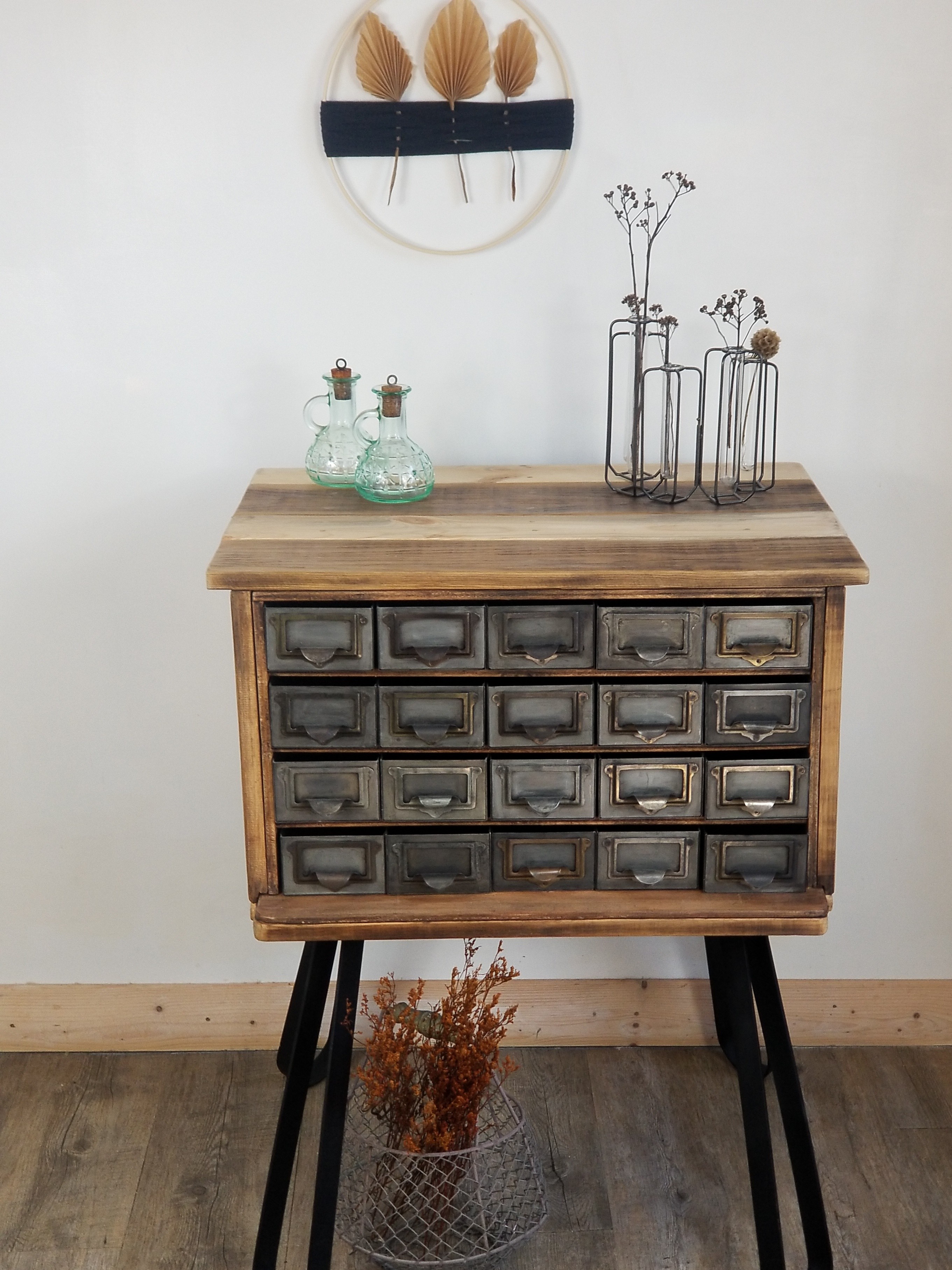 Ces tiroirs industriels métalliques, après des années de bons et loyaux services en usine ont trouvé un nouveau cadre de vie pour leur changement d'activité. Ils ont été adoptés par un meuble entierement créer et réaliser par OXYDE. Ce casier a été fabriqué en planches assemblées par cheville bois puis posé sur des pieds en acier formés par nos soins.