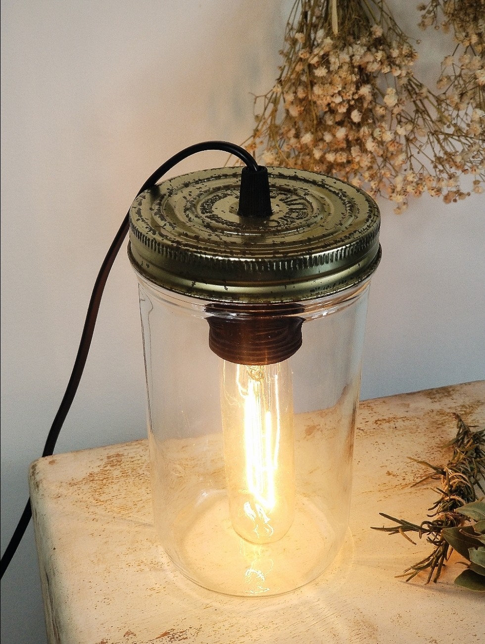Lampe composée d'un bocal vintage Luminarc mis en valeur par une ampoule LED E27à filament.