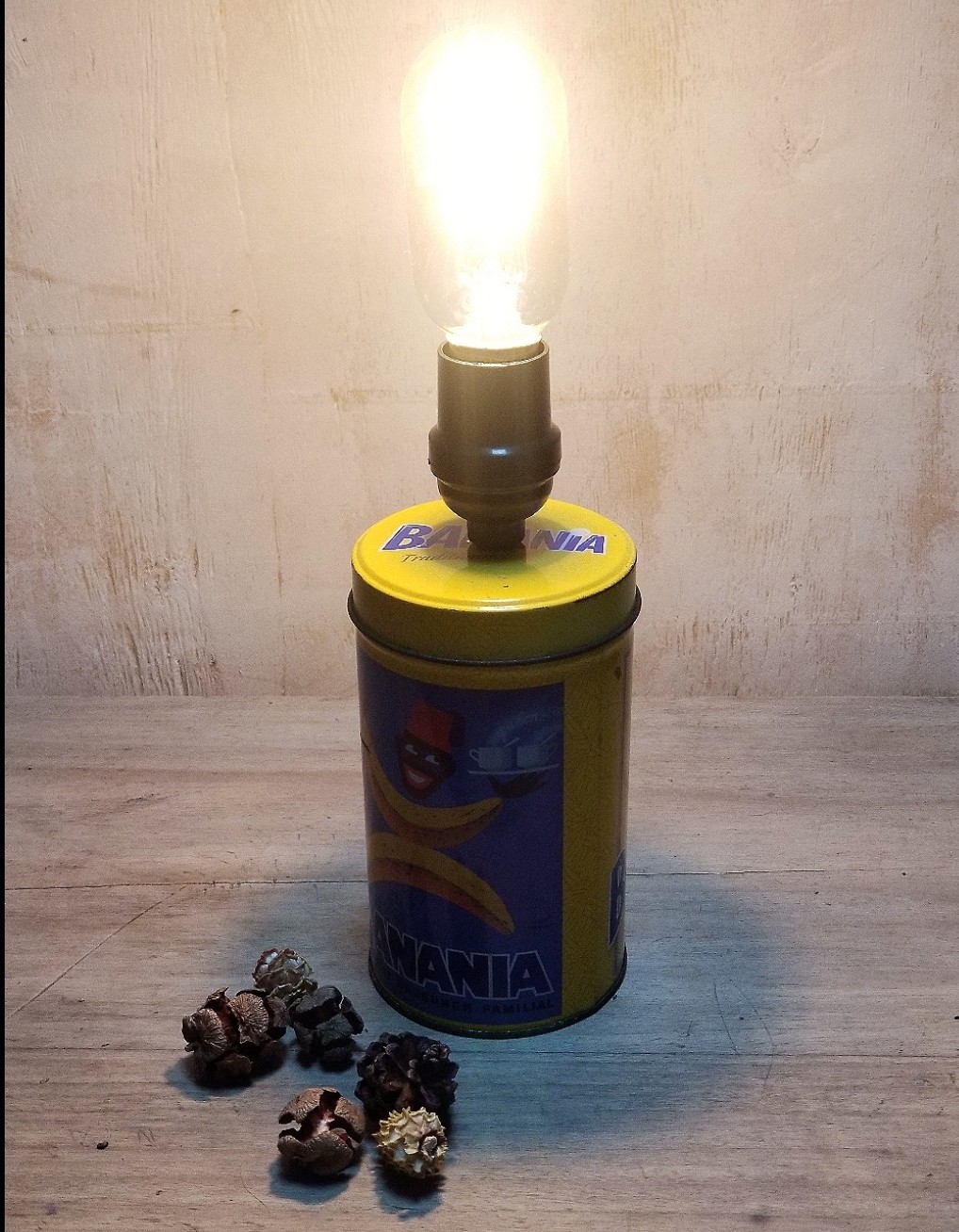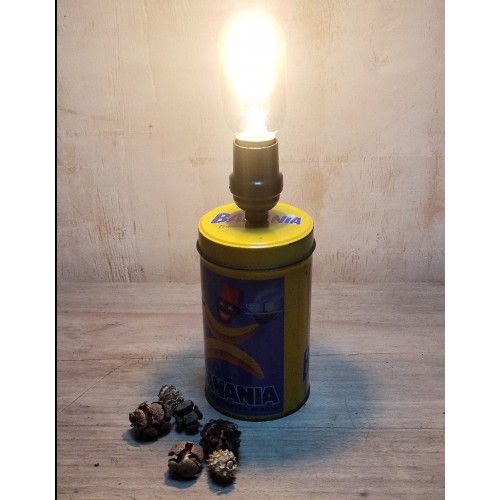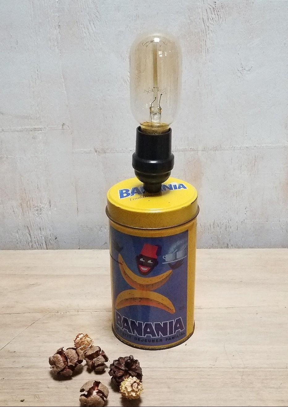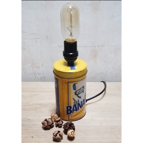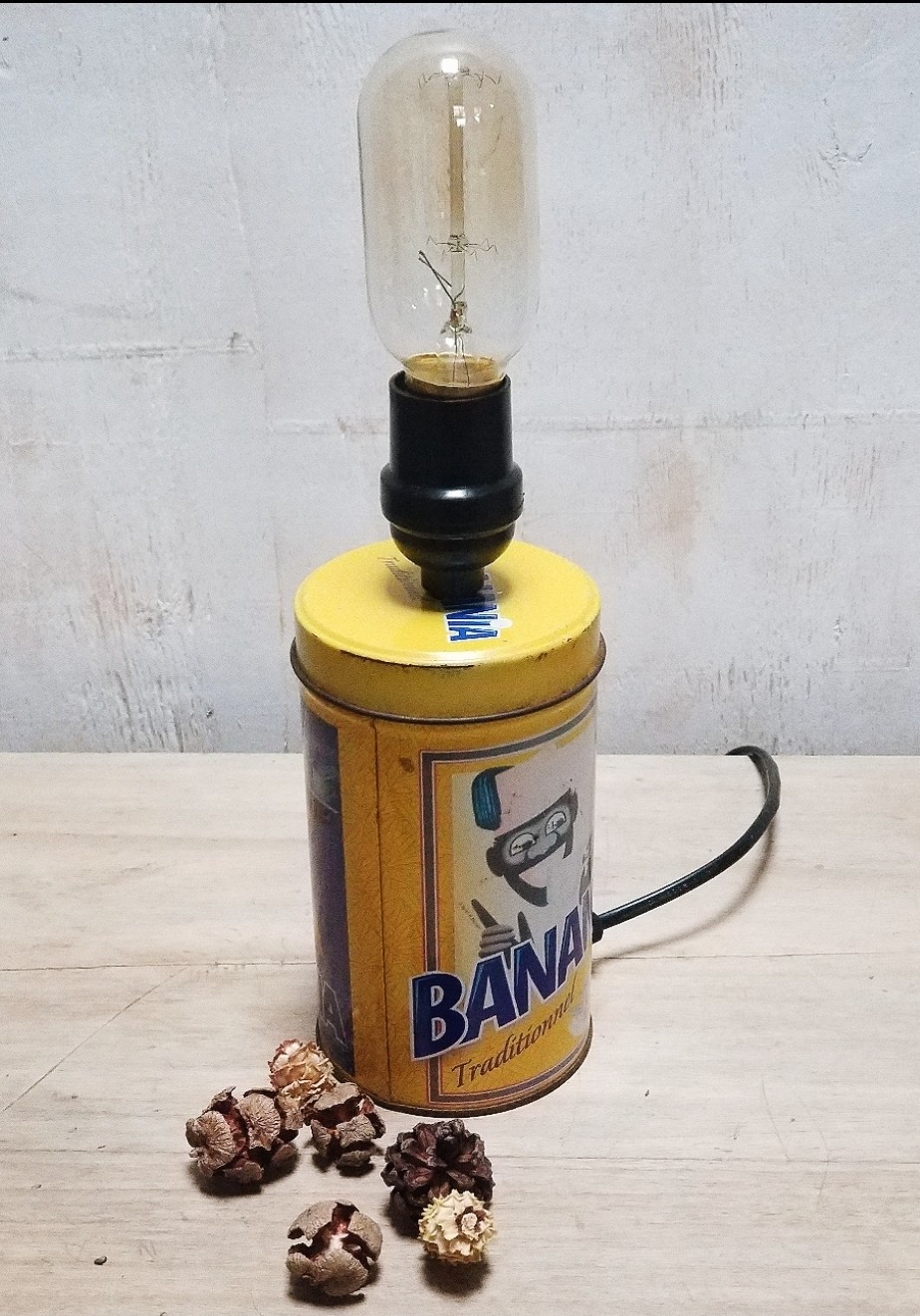Lampe réalisée avec une boîte Banania vintage de forme ronde