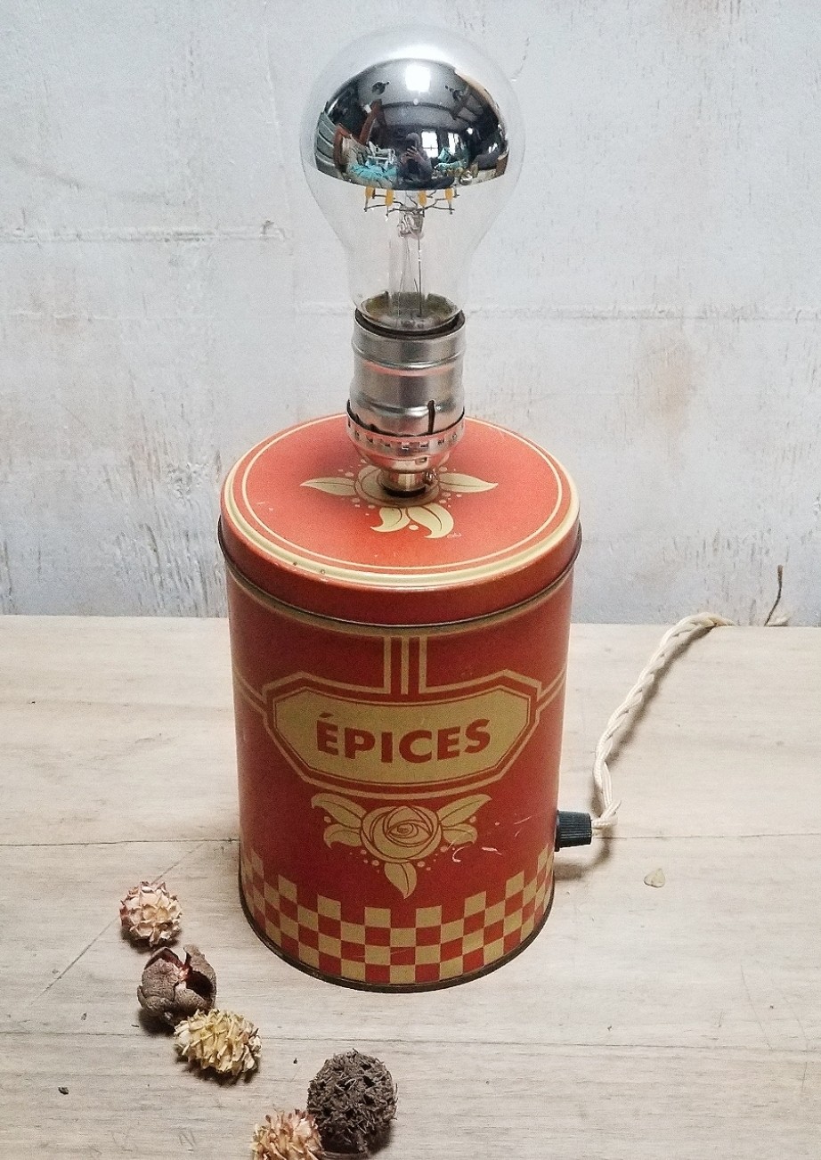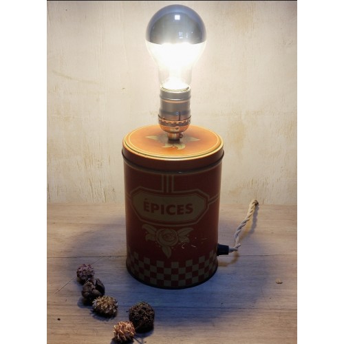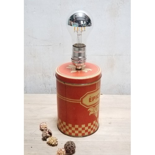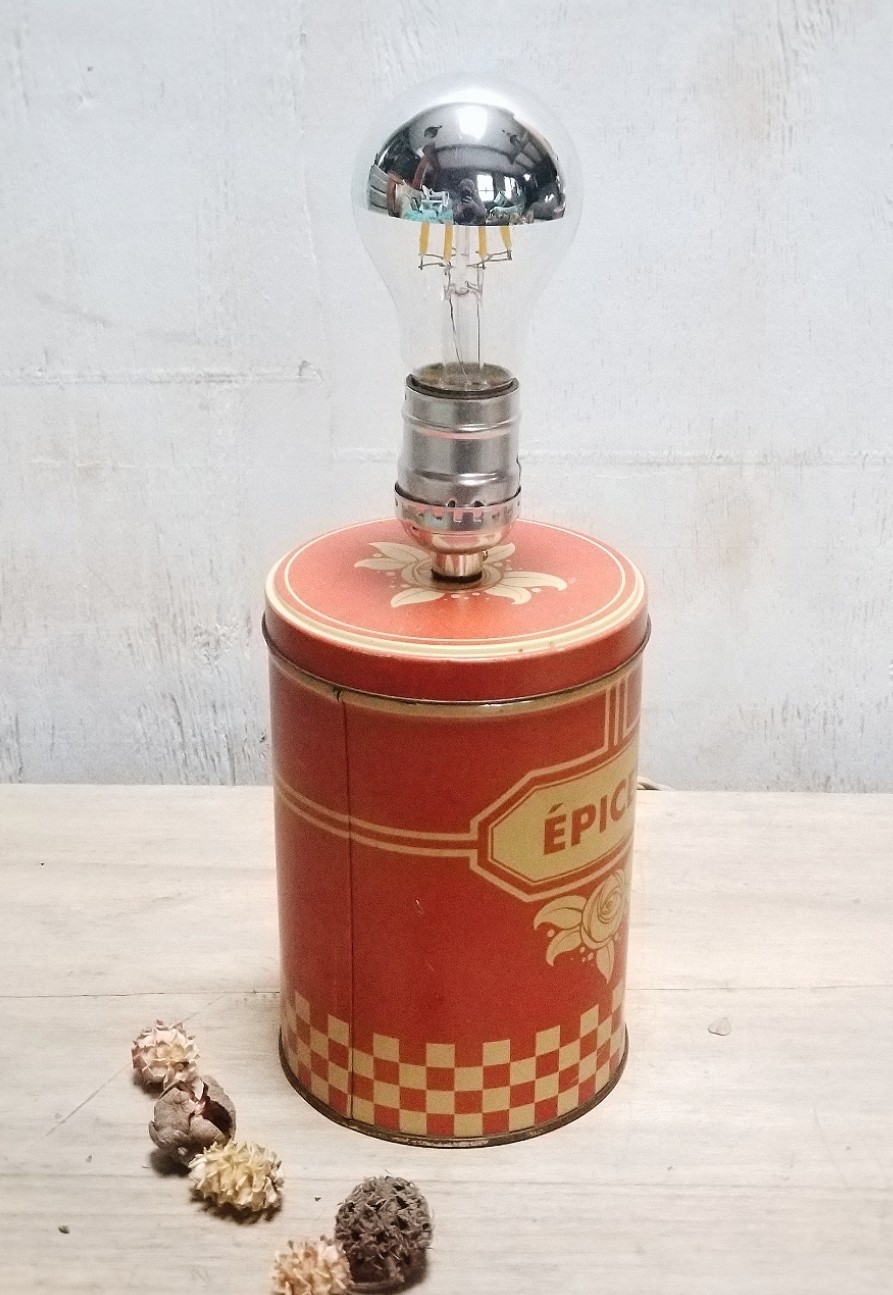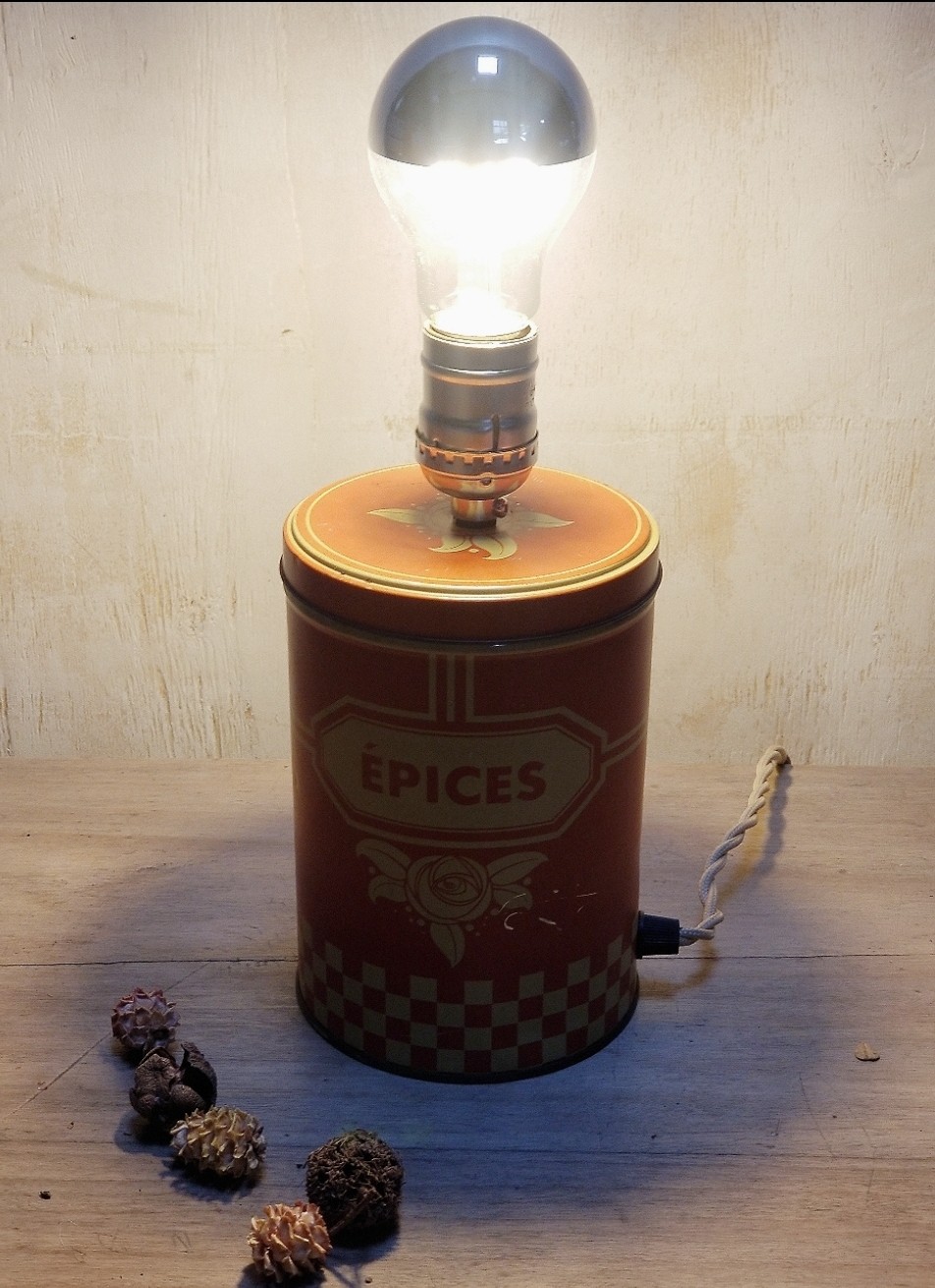 Lampe réalisée avec une boîte métallique vintage qui permettait de conserver les produits d'épicerie.