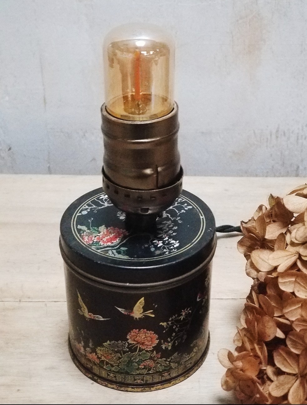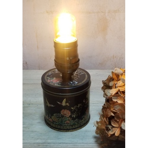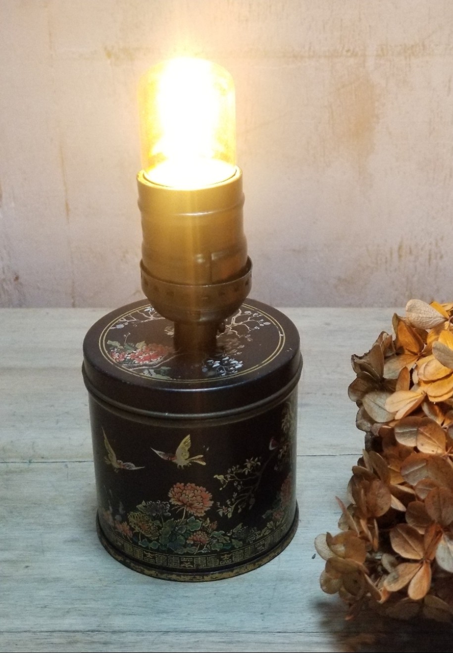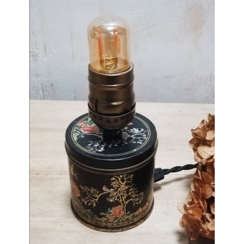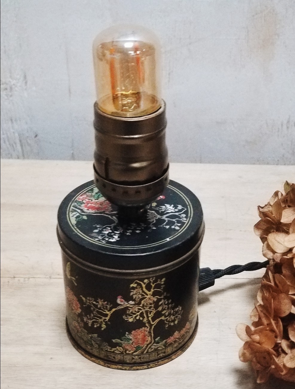 Lampe réalisée avec une boîte métallique ronde vintage de conservation du thé.