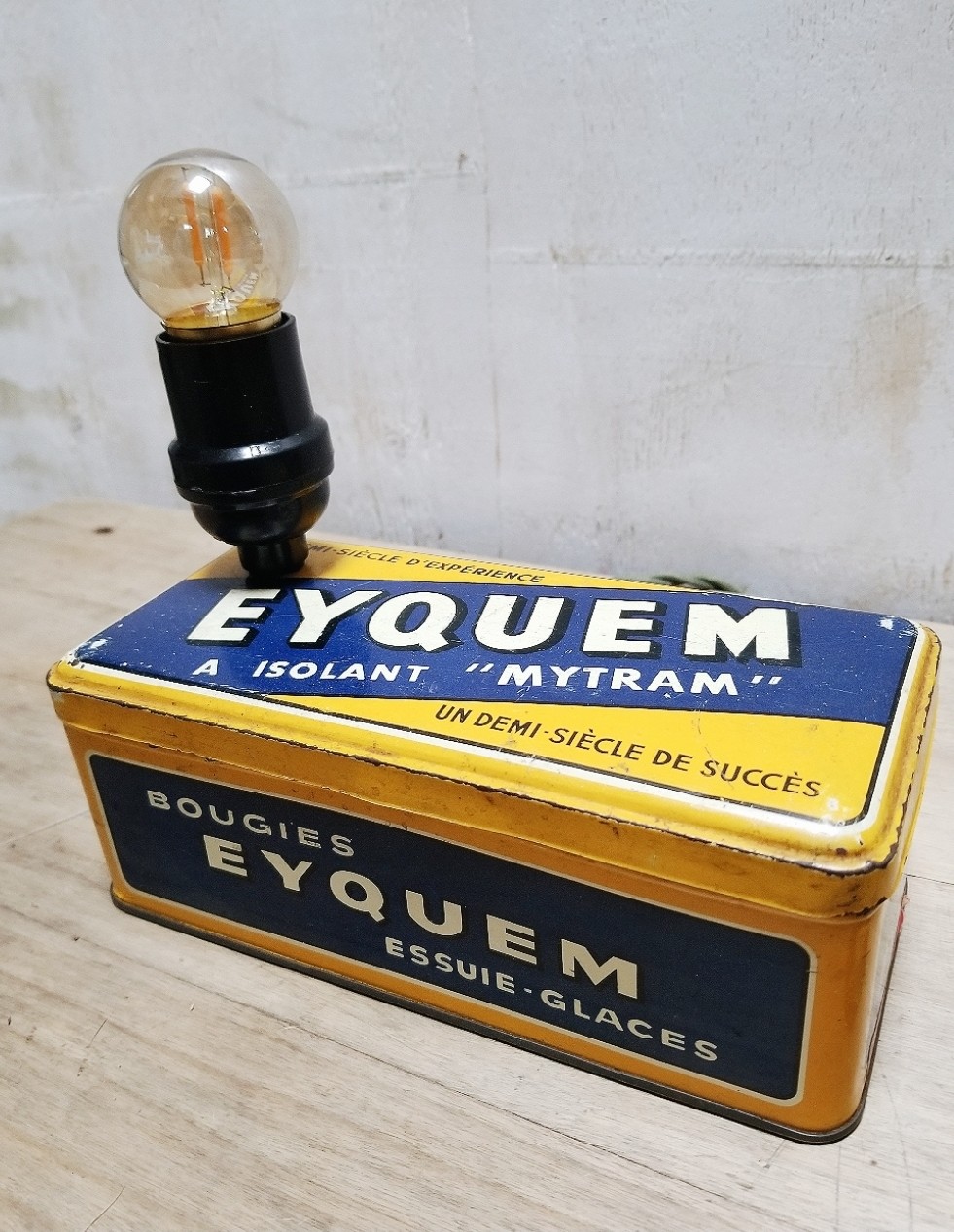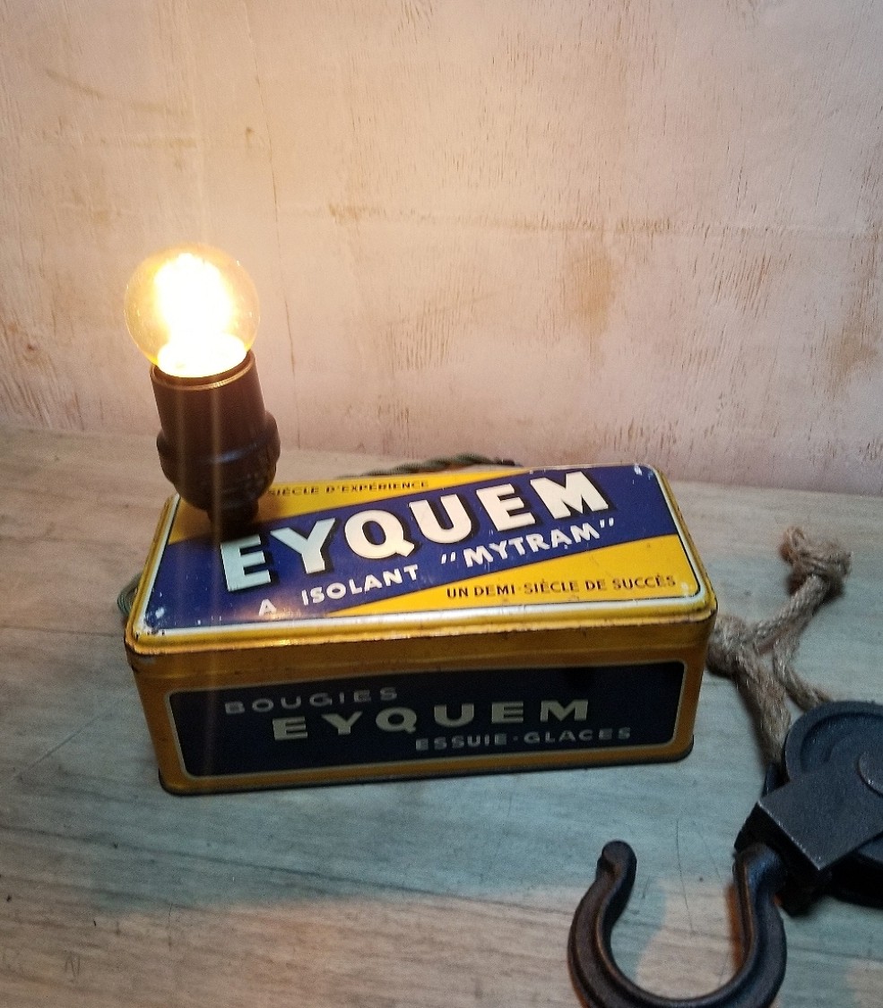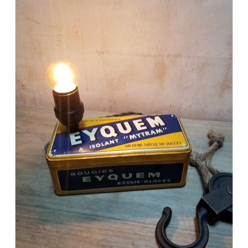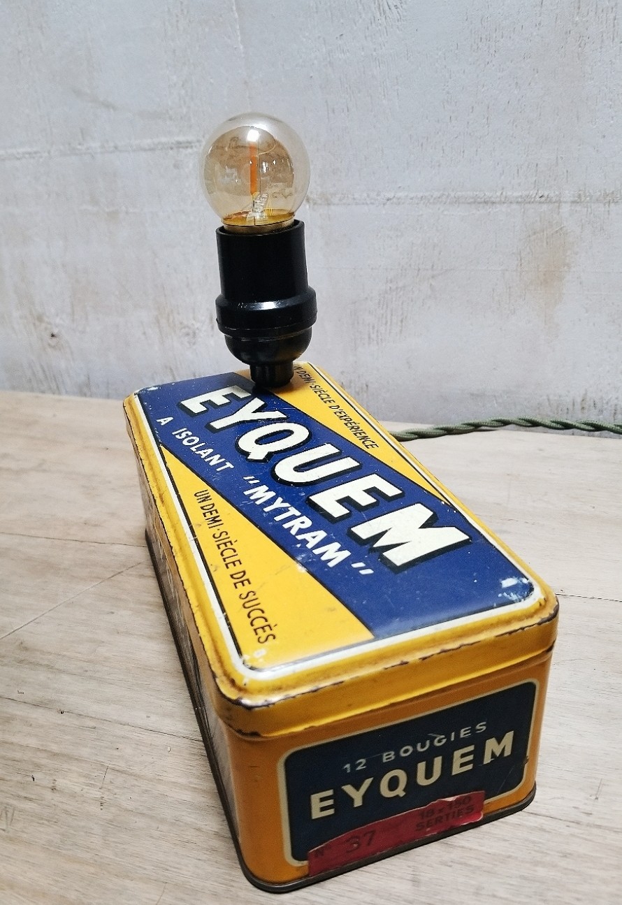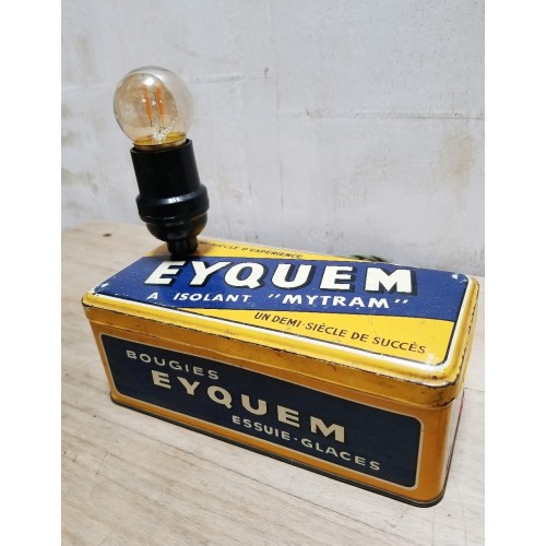 Lampe réalisée avec une boîte métallique vintage de bougie de voiture de la marque iconique Eyquem.