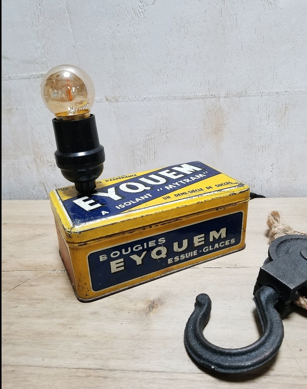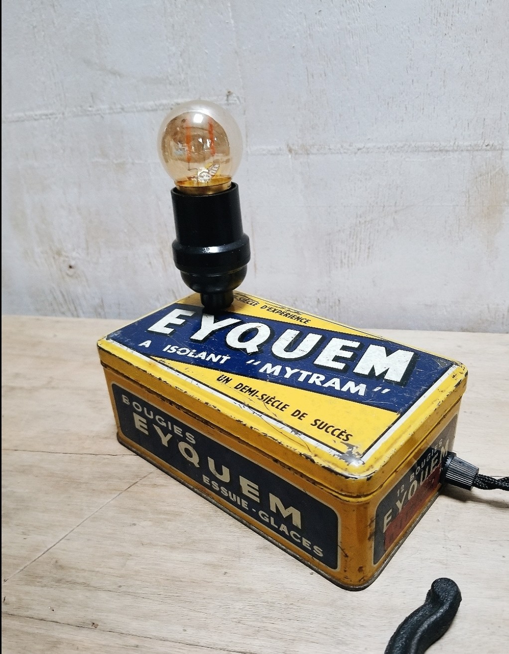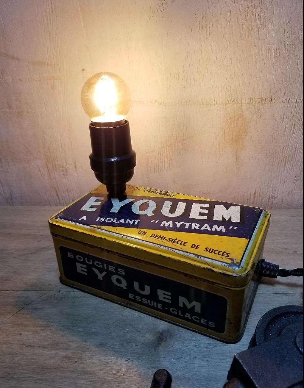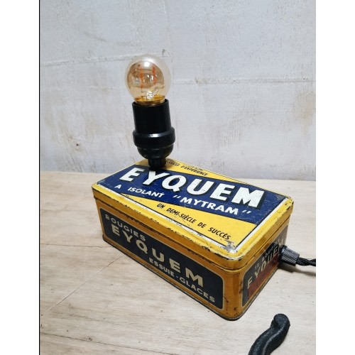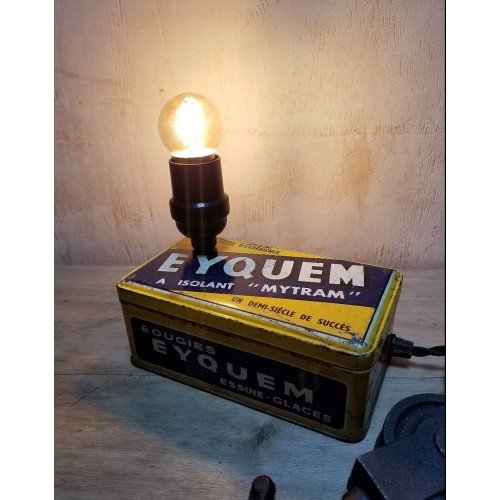 Lampe réalisée avec une boîte métallique vintage de bougie de voiture de la marque iconique Eyquem.