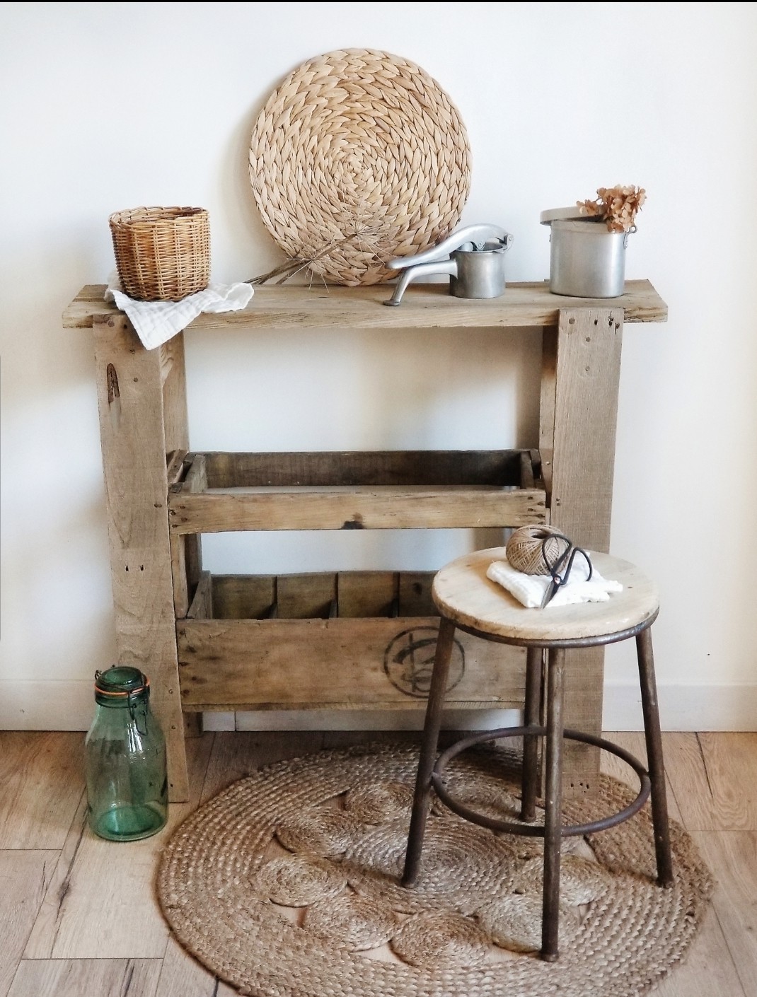 Console en bois brut d'atelier et casier de bouteilles de cidre vintage de 1969.