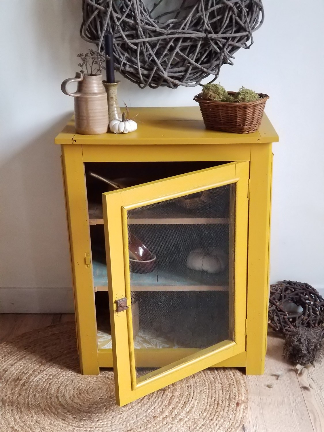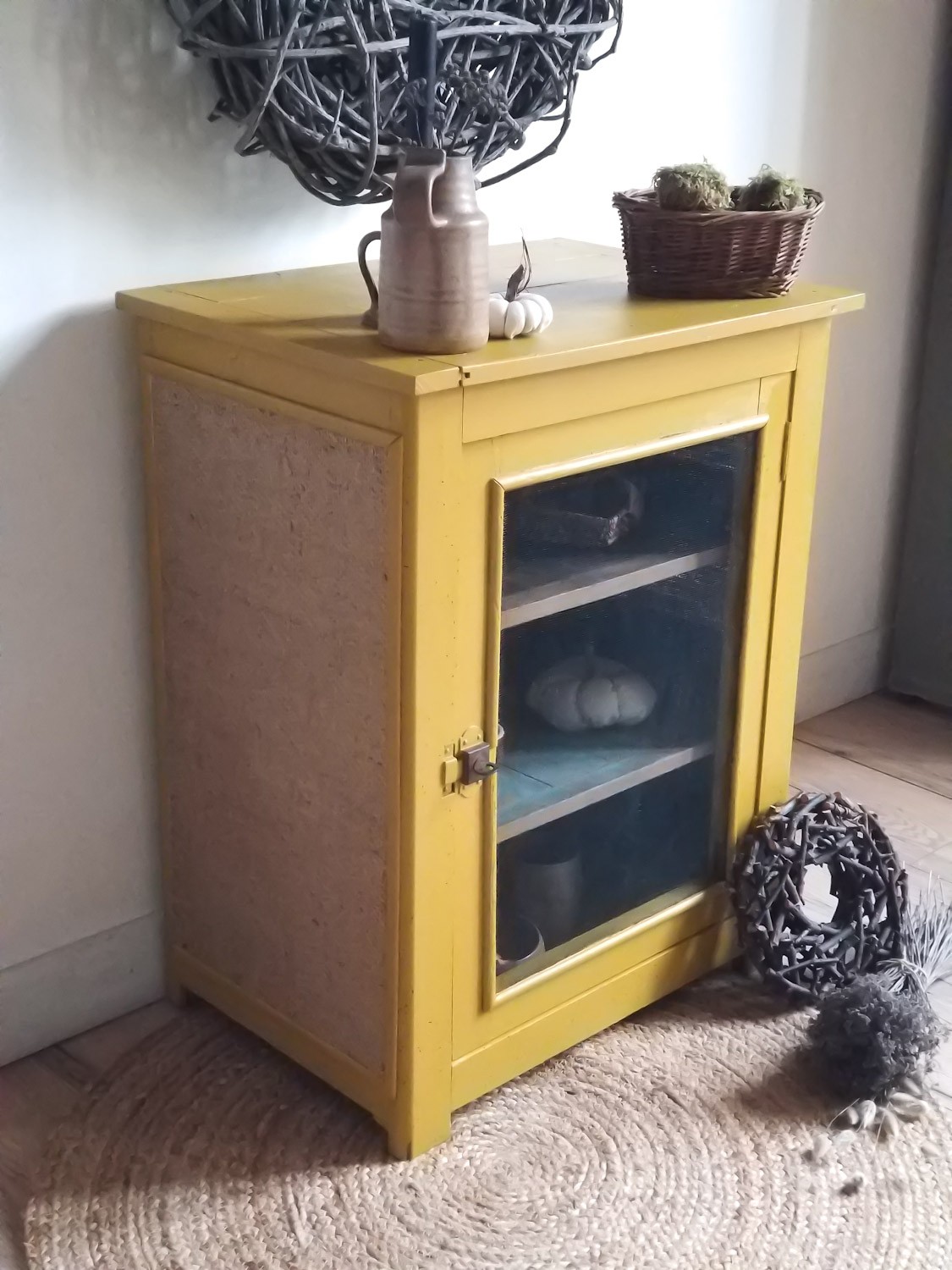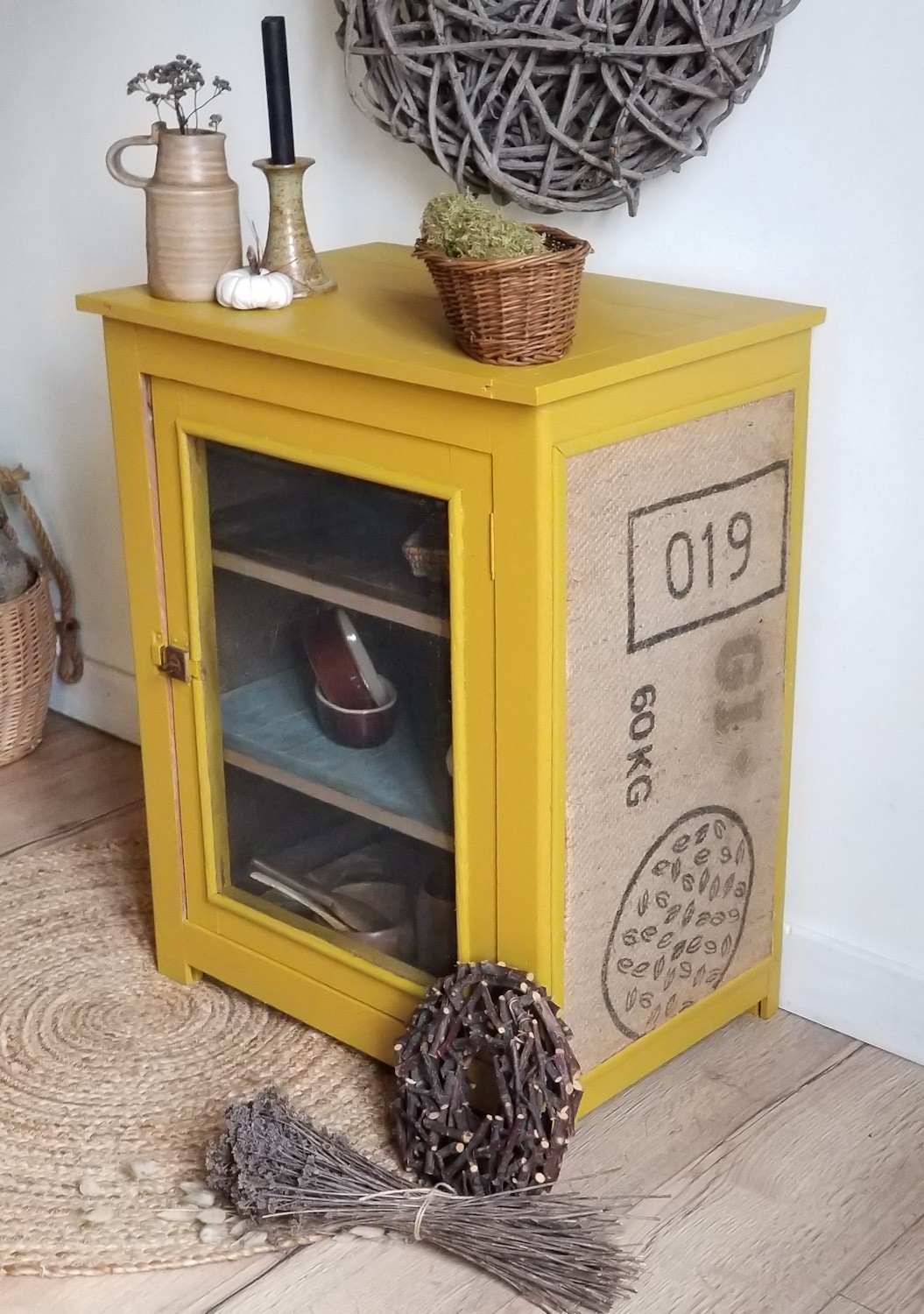 Chaque détail a été pensé pour préserver son âme tout en lui offrant une touche de fraîcheur : une peinture jaune moutarde vibrante, une étagère en bois brut, une autre patinée en bleu vieilli, et un fond délicatement tapissé d’un papier fleuri moutarde et blanc. Ses côtés, eux, sont habillés d’une toile de jute authentique issue d’anciens sacs de café – clin d’œil à son passé et à l’amour des choses bien faites.