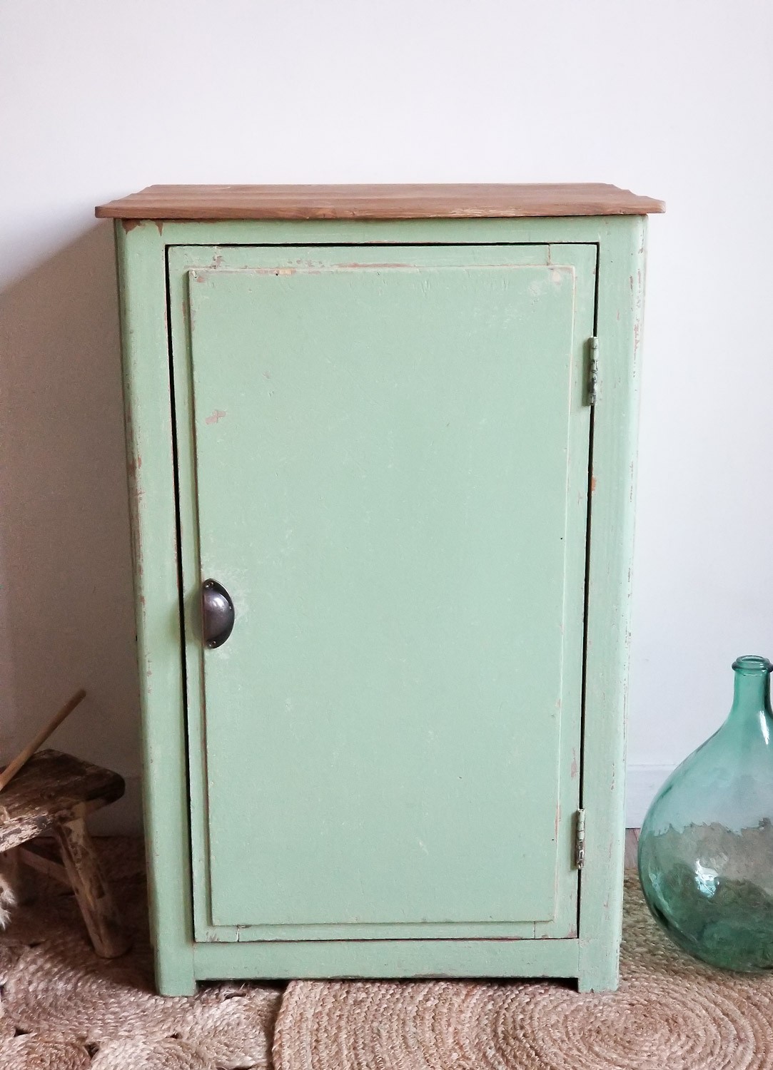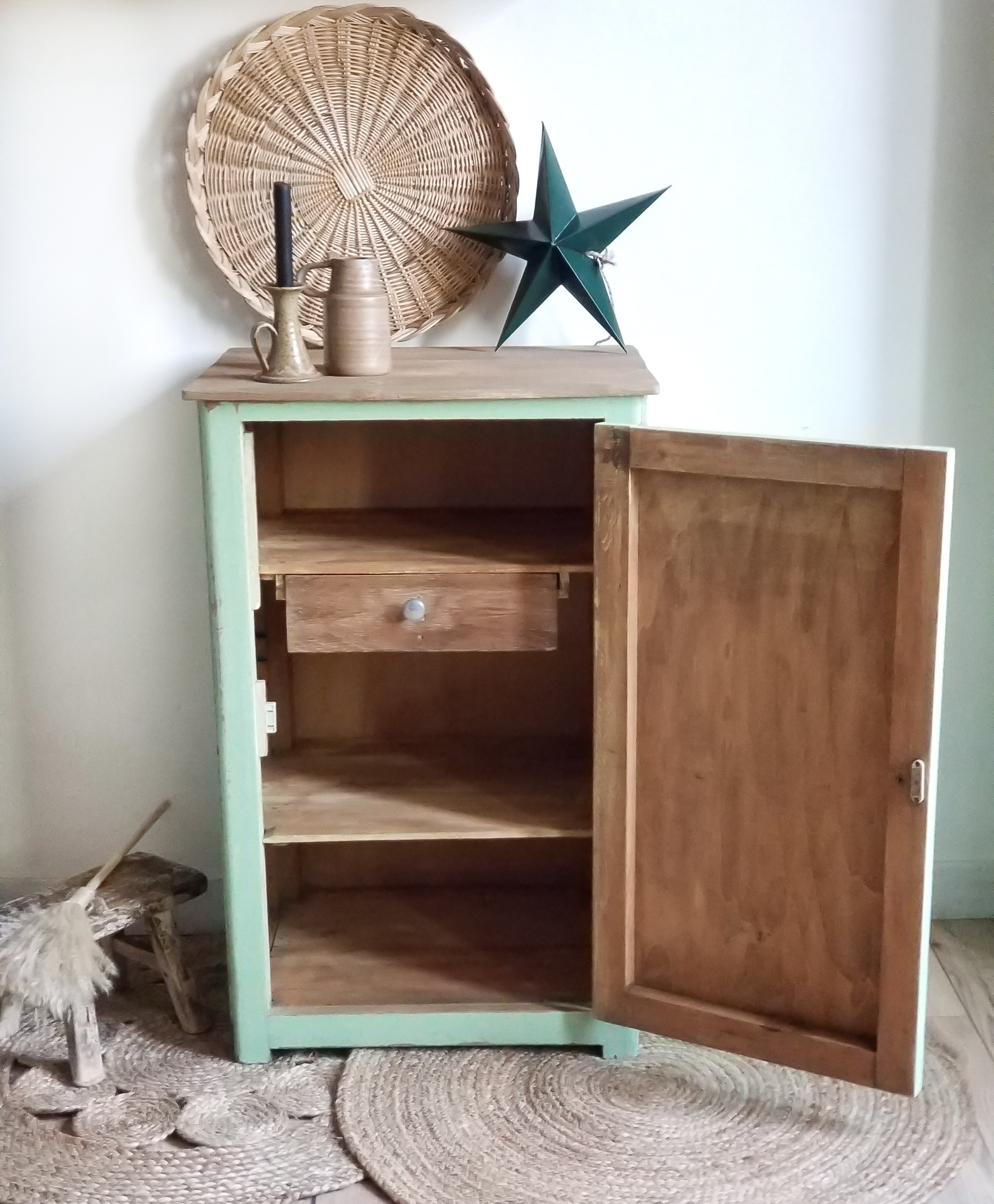 Authentique petit meuble de cuisine avec son tiroir à doubles compartiments en bois peint dont la patine est d'origine.