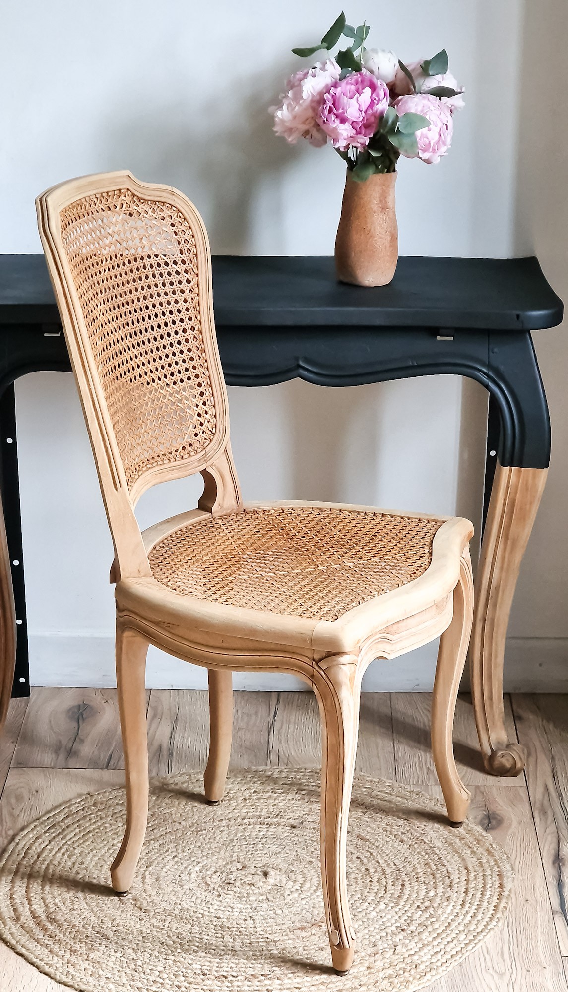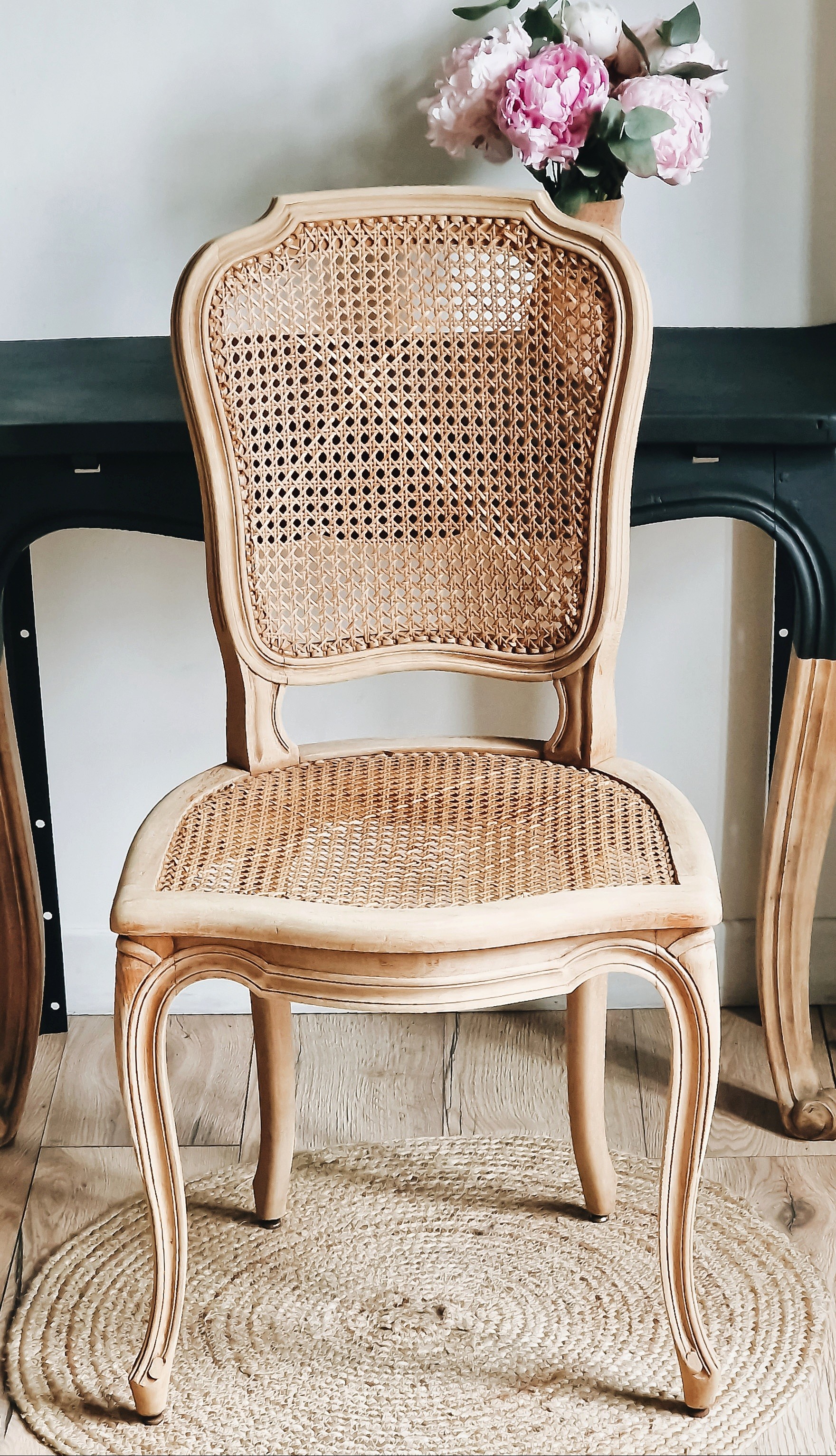 Jolie chaise cannée de style louis XV , structure en bois de hêtre brut, pieds avants galbés et volutés, Cannage traditionnel.