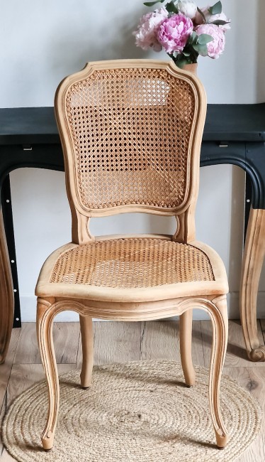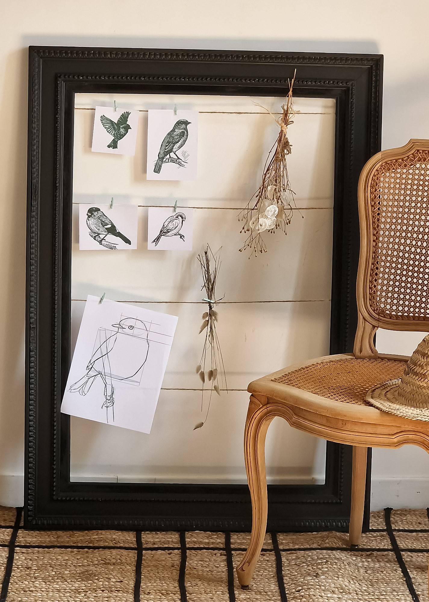 Ensemble complet comprenant la console vintage + la chaise cannée + le cadre d'affichage vintage