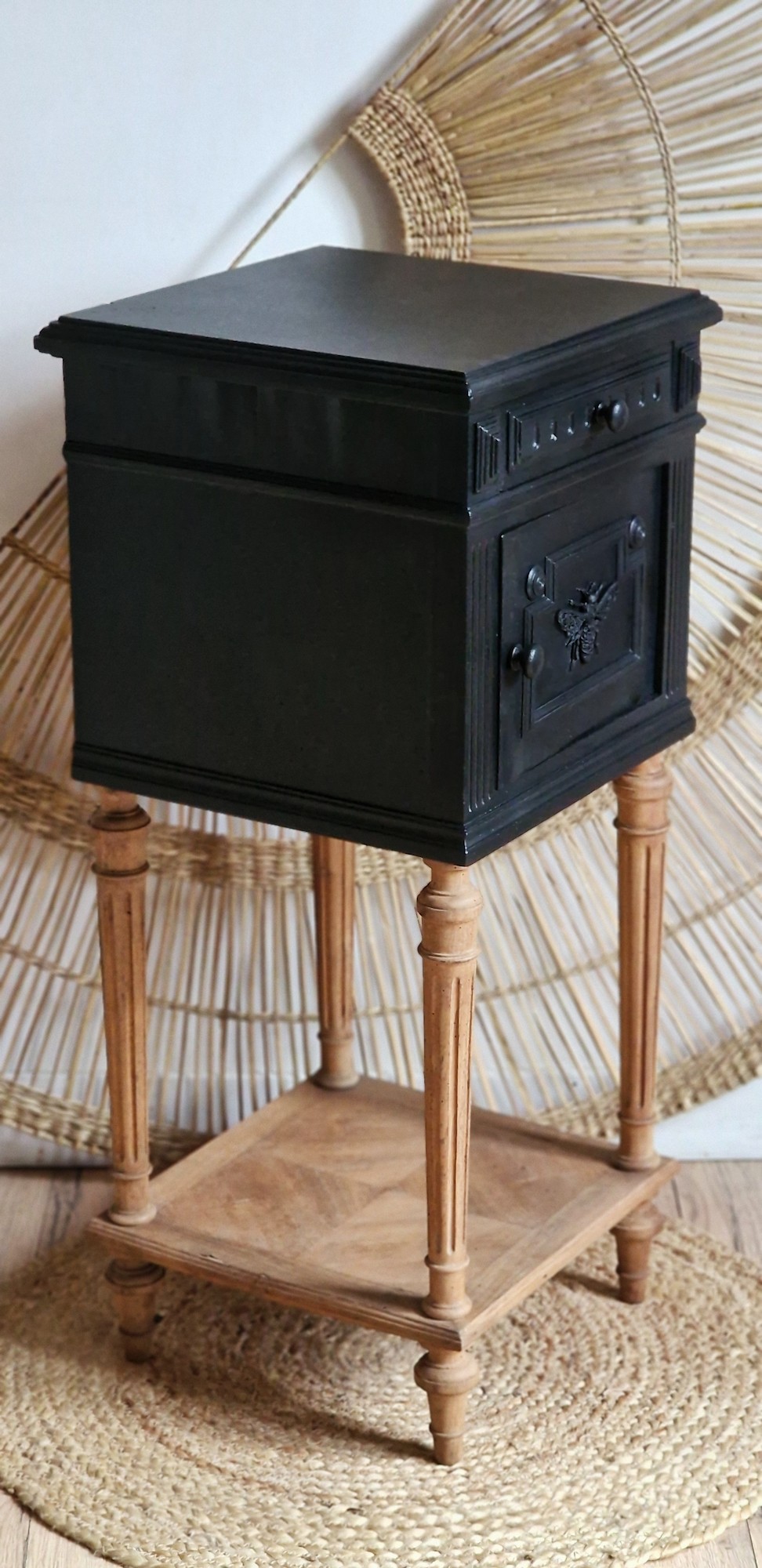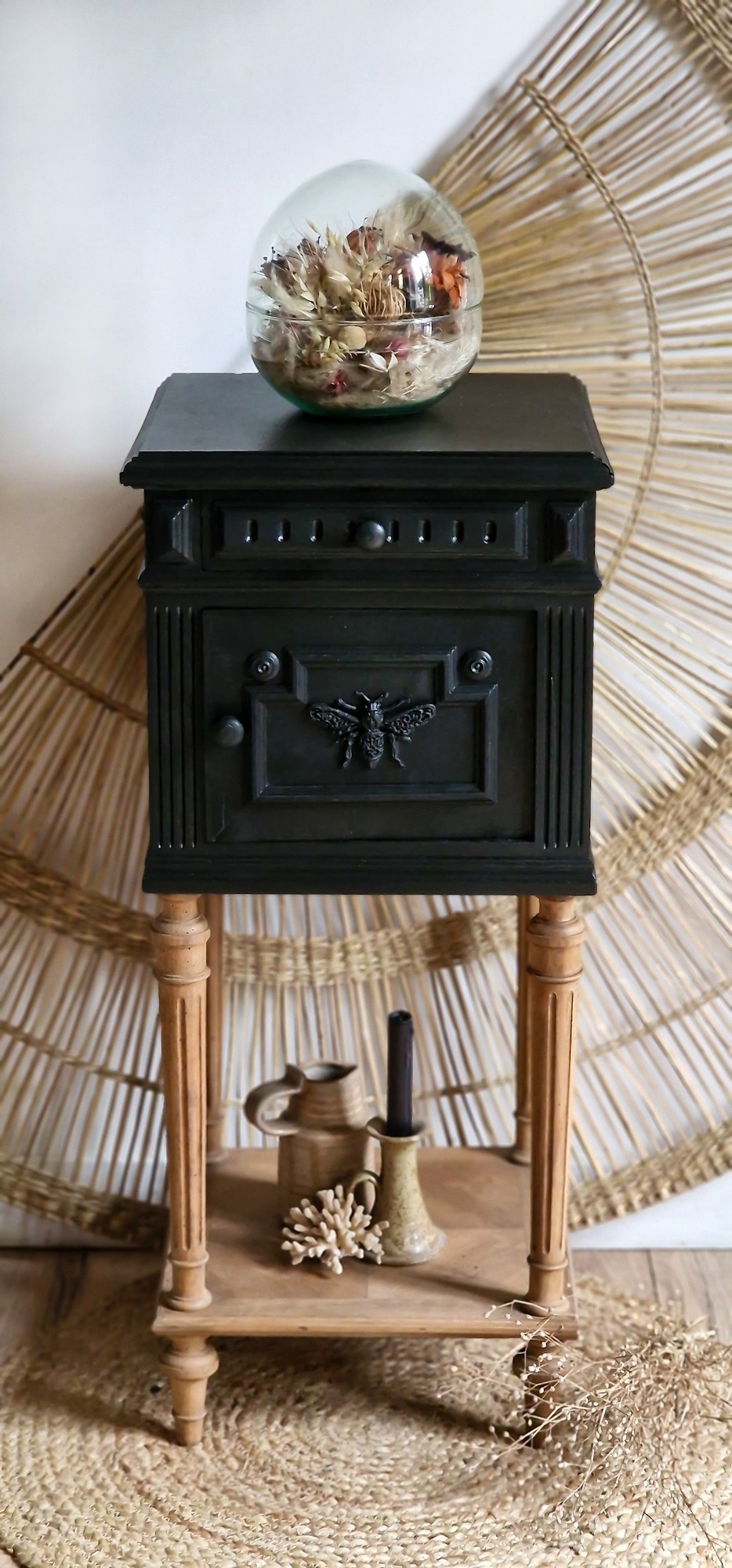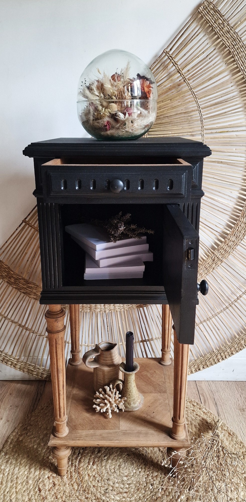 meuble de toilette vintage au charme indéniable. Jadis oublié, ce bijou a retrouvé une nouvelle jeunesse grâce à une peinture noir mat élégante qui met en valeur ses lignes délicates.