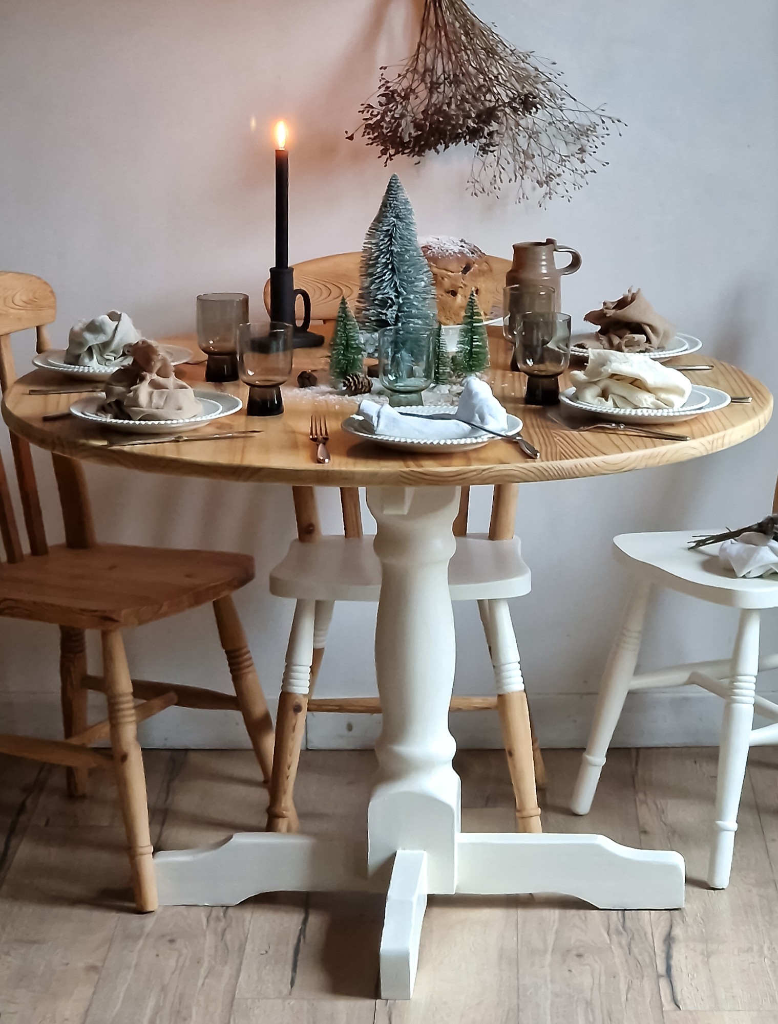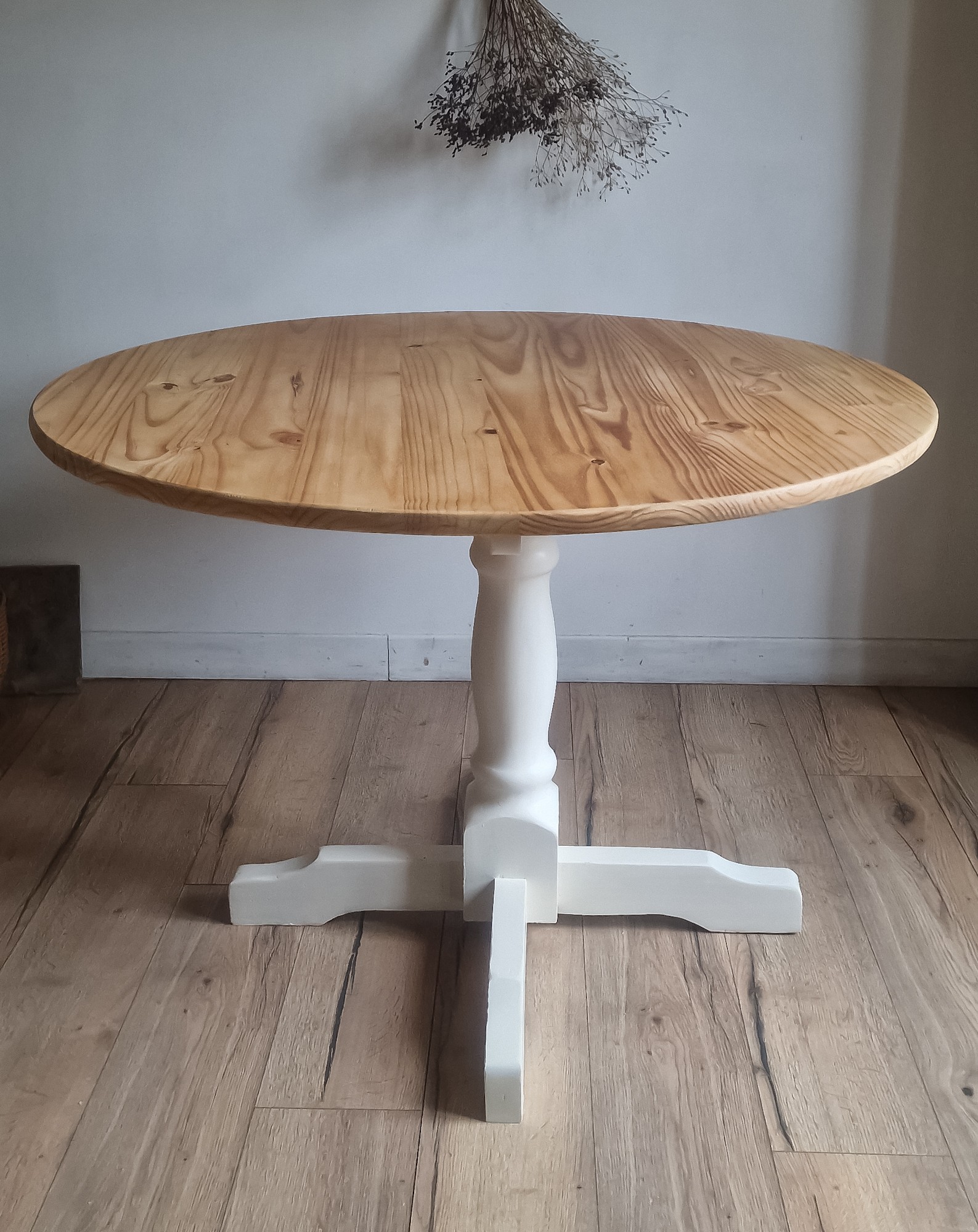 Cette table ronde, prénommée Amandine, poncée à la main est une pièce maîtresse du mobilier ancien. Elme se distingue par sa finition peinte sur son pied et son vernis mat, qui lui confère un charme intemporel et une mabiàce chalet.