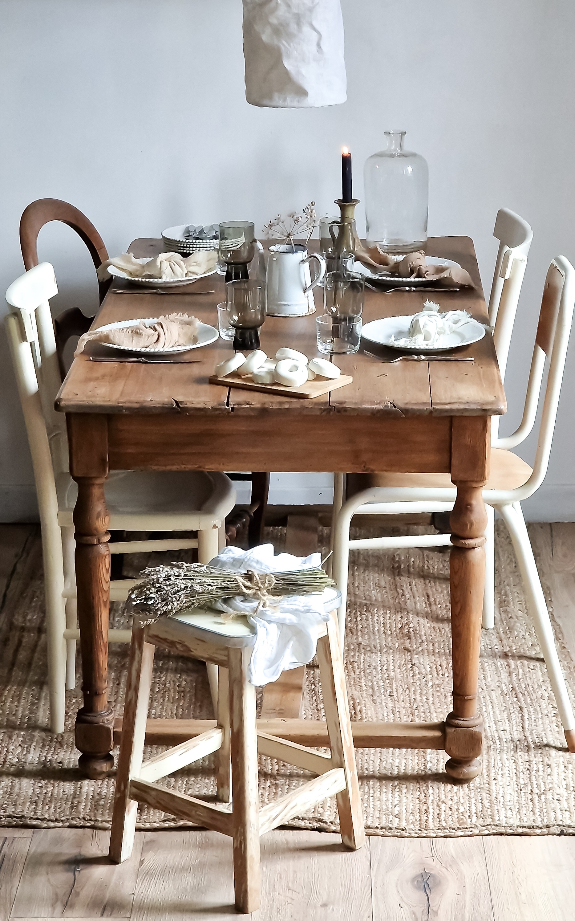 Dans un quartier animé de Paris, au cœur d'un appartement au charme vintage, trônait une ancienne table de ferme drapier Bénédicte, un véritable vestige des siècles passés.