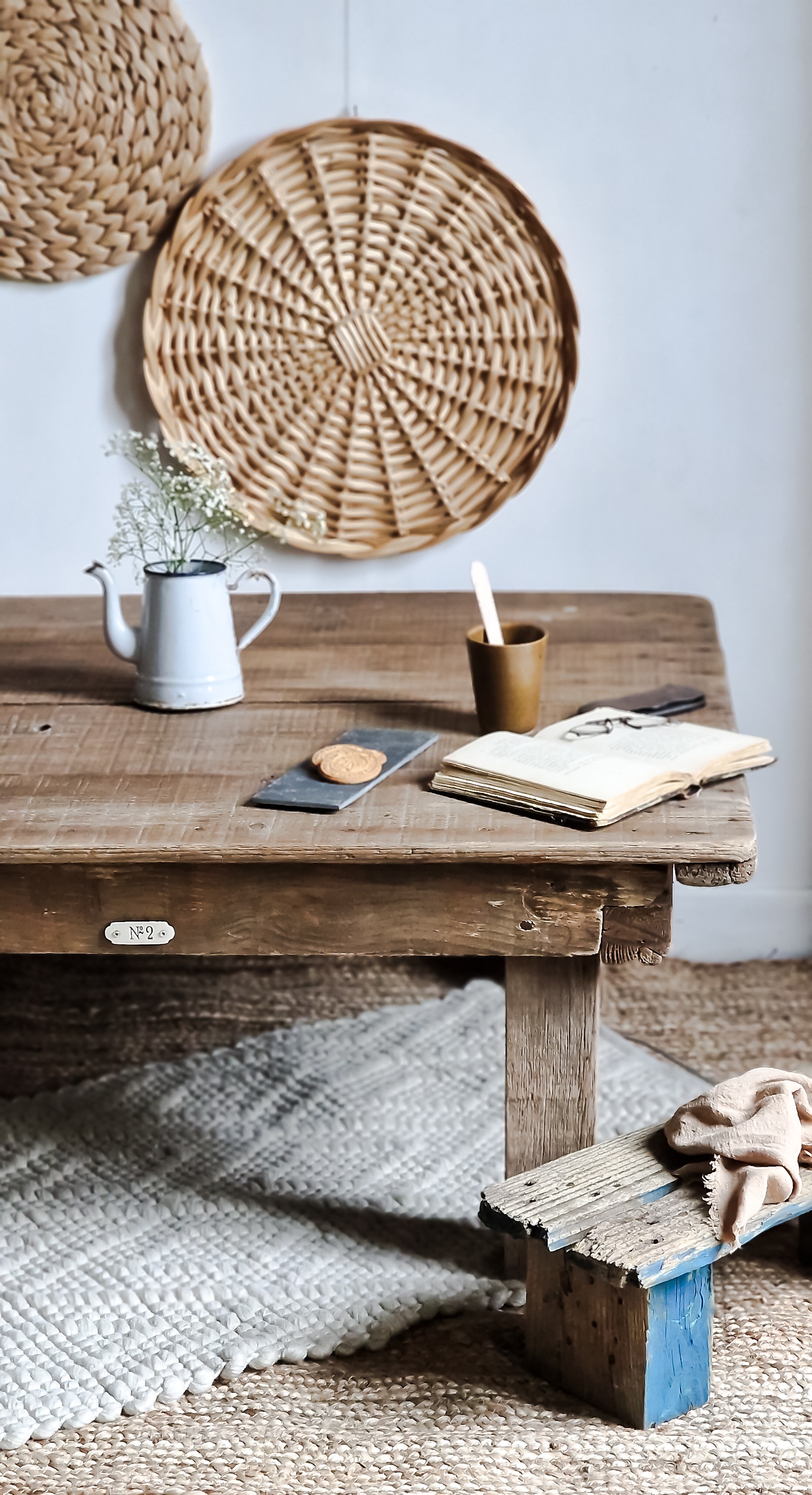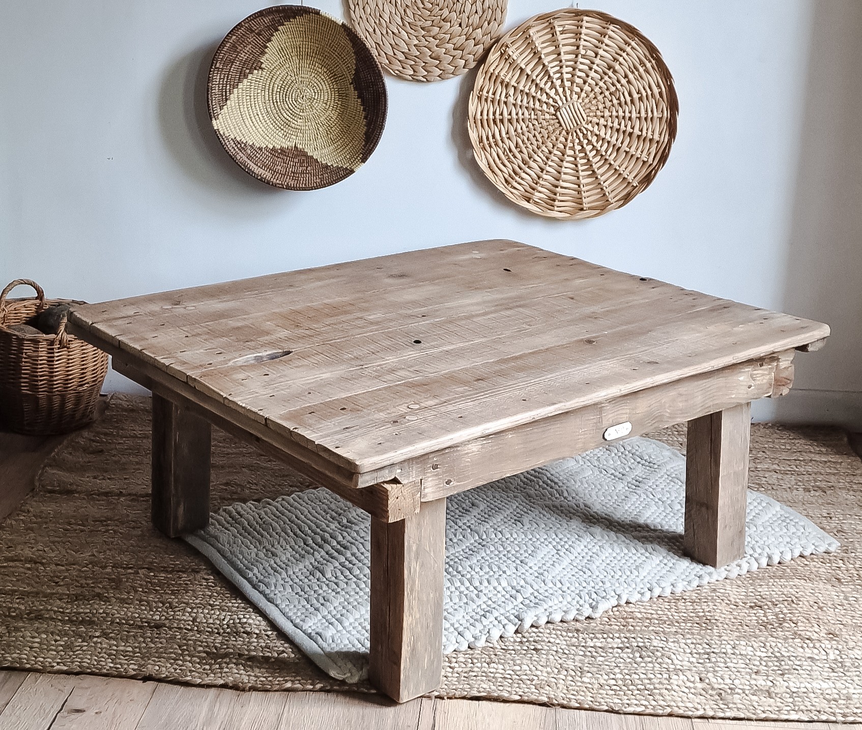 Authentique table basse en bois massif, fabriquée à la main en France à partir de matériaux anciens. Chaque pièce est unique.