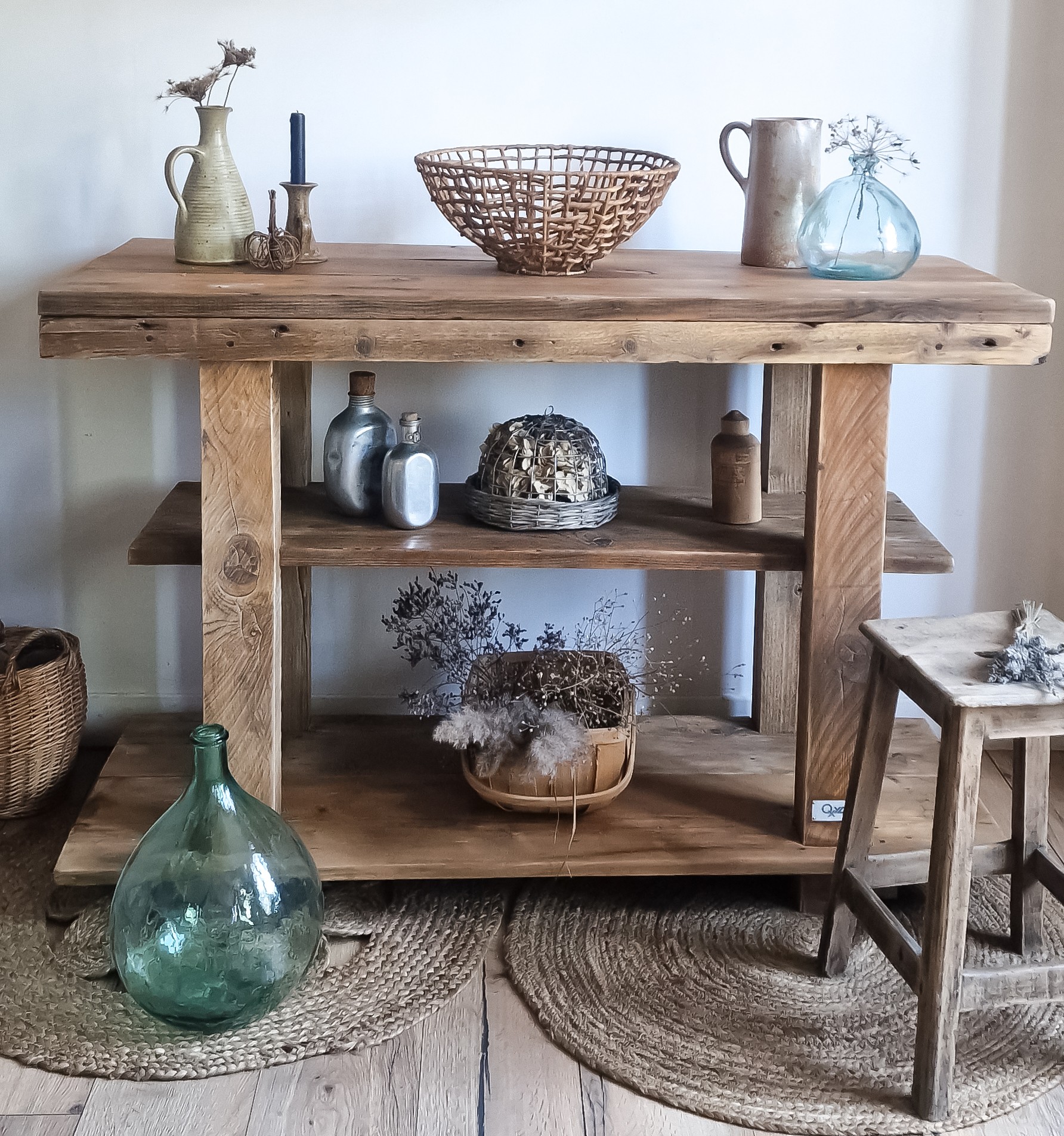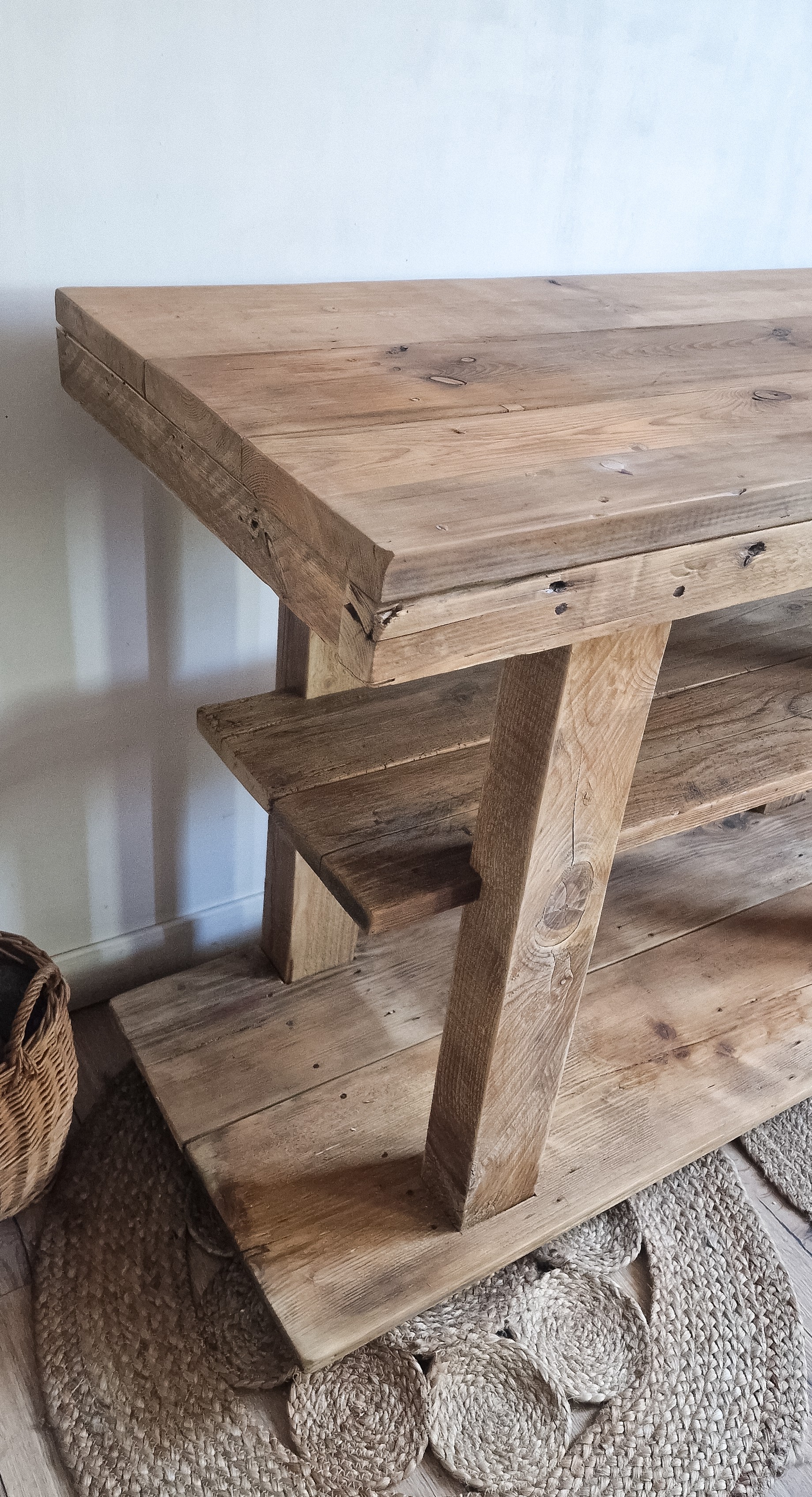 Console établi en bois brut.