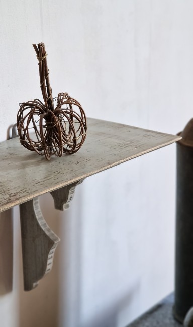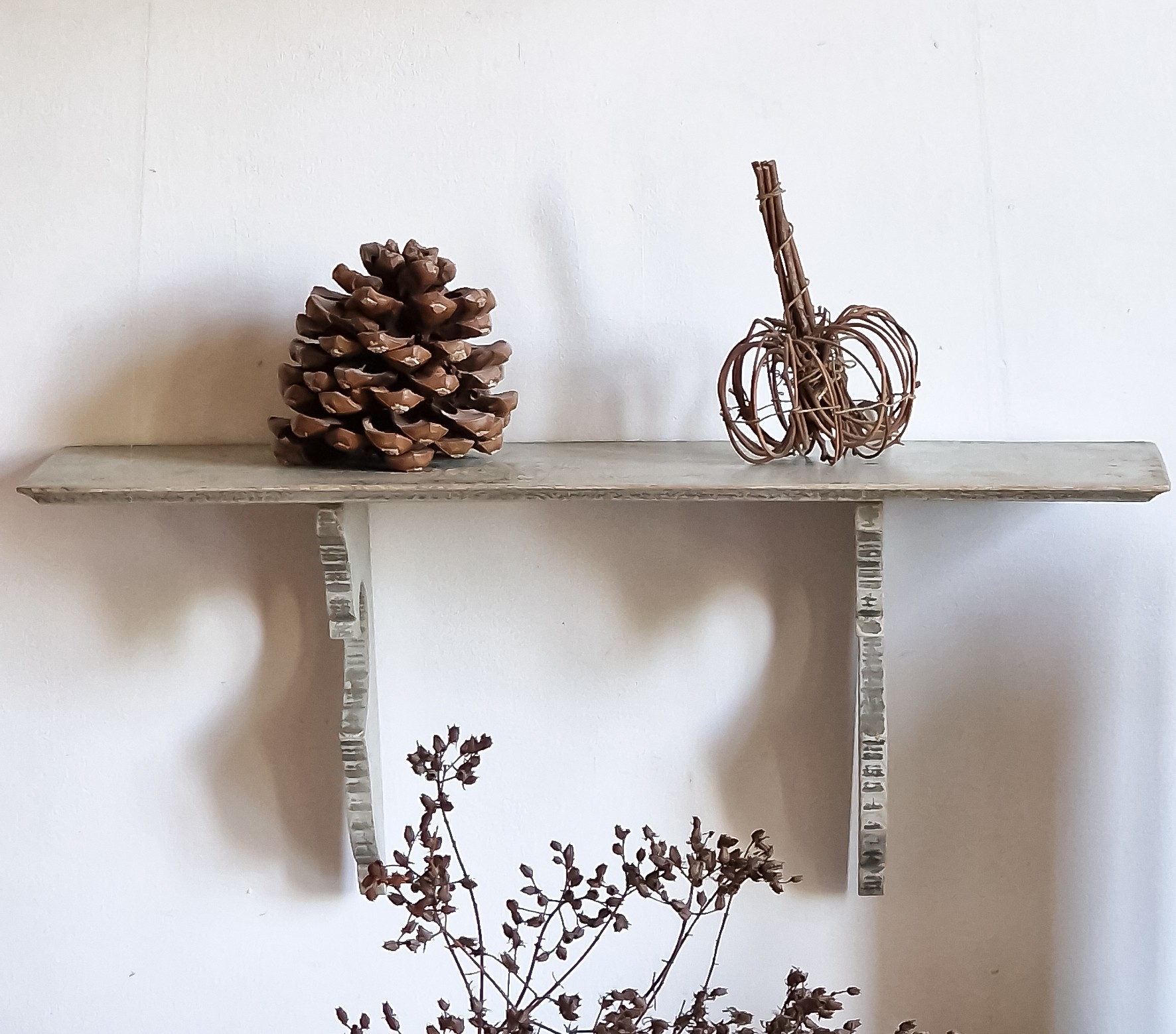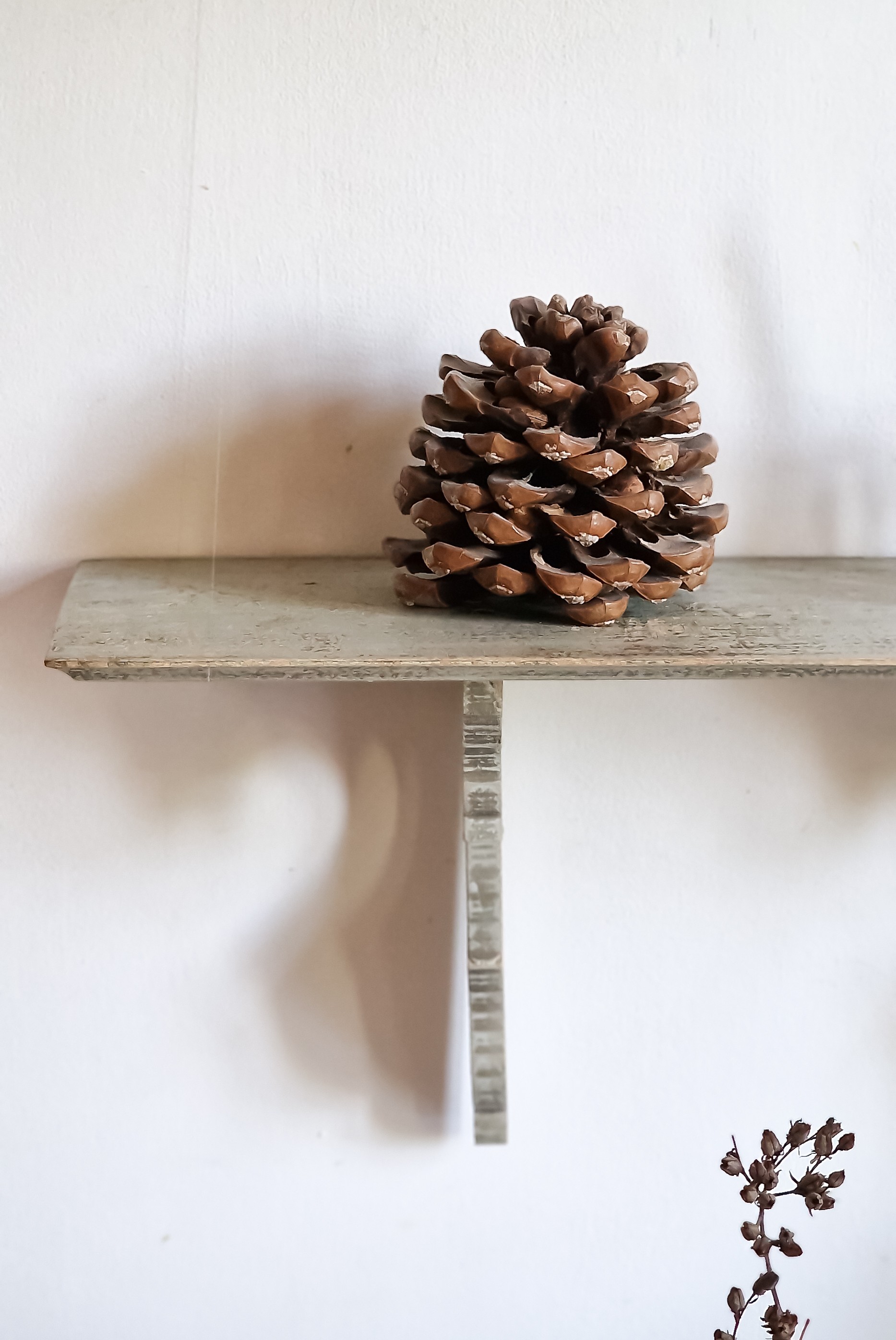 Ancienne étagère patinée pour accueillir vos trésors simples : une pomme de pin, une vieille bouteille, une branche oubliée.