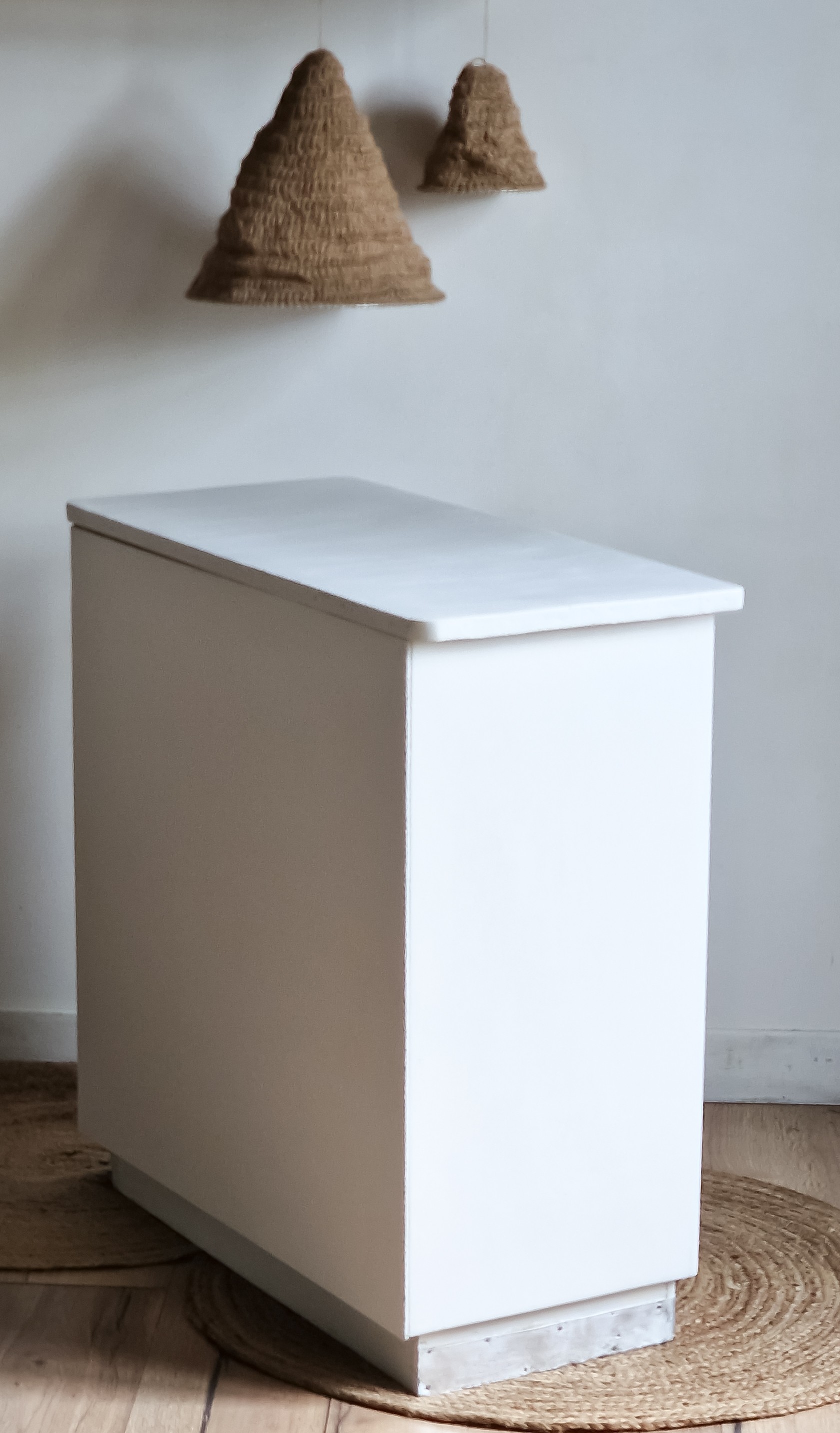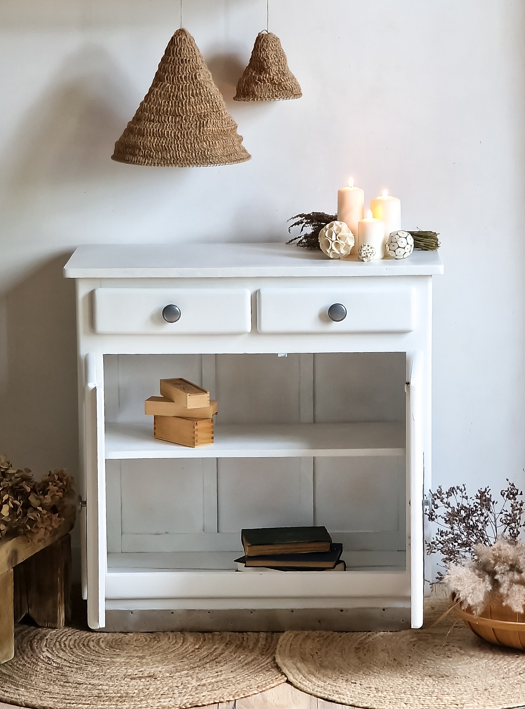 un buffet vintage 50 pas comme les autres. Derrière ses lignes simples et sa robe blanche patinée se cache un meuble plein de poésie et de praticité.