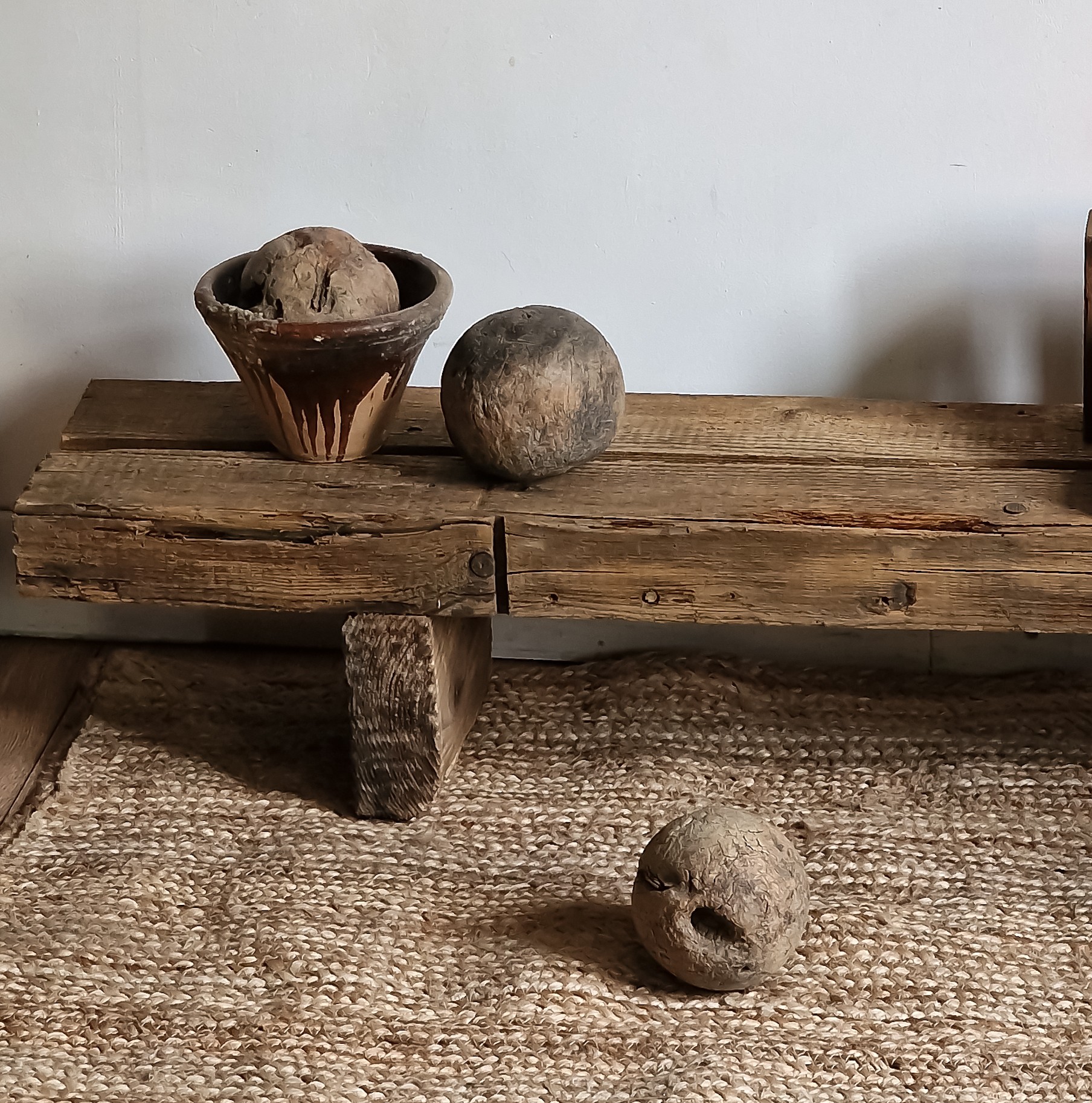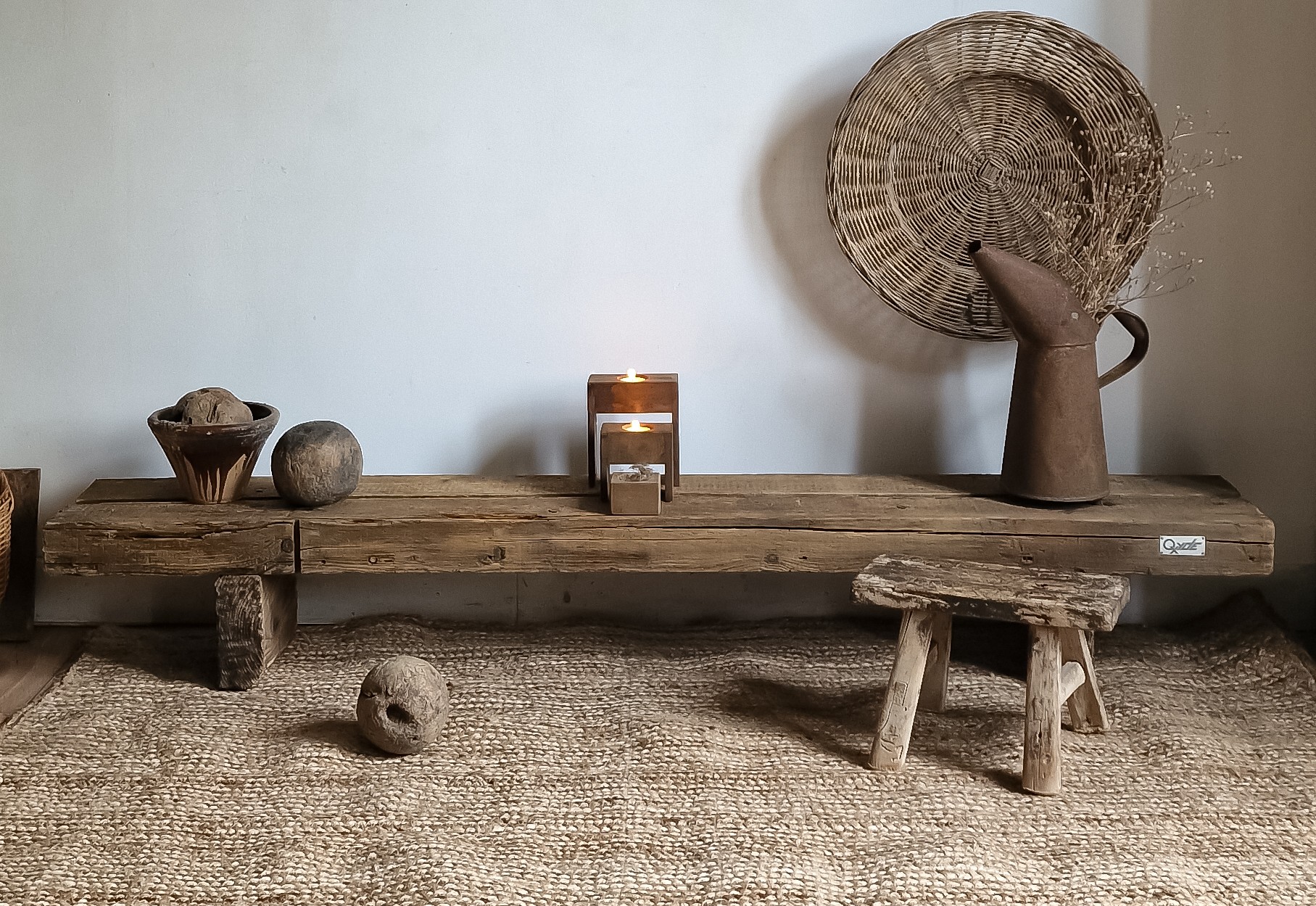 Authenticité brute et beauté imparfaite : cette console-banc wabi-sabi en bois ancien incarne l’élégance du temps qui passe. Chaque fissure raconte une histoire, chaque nœud révèle son âme. Une pièce unique qui fait dialoguer simplicité et caractère.