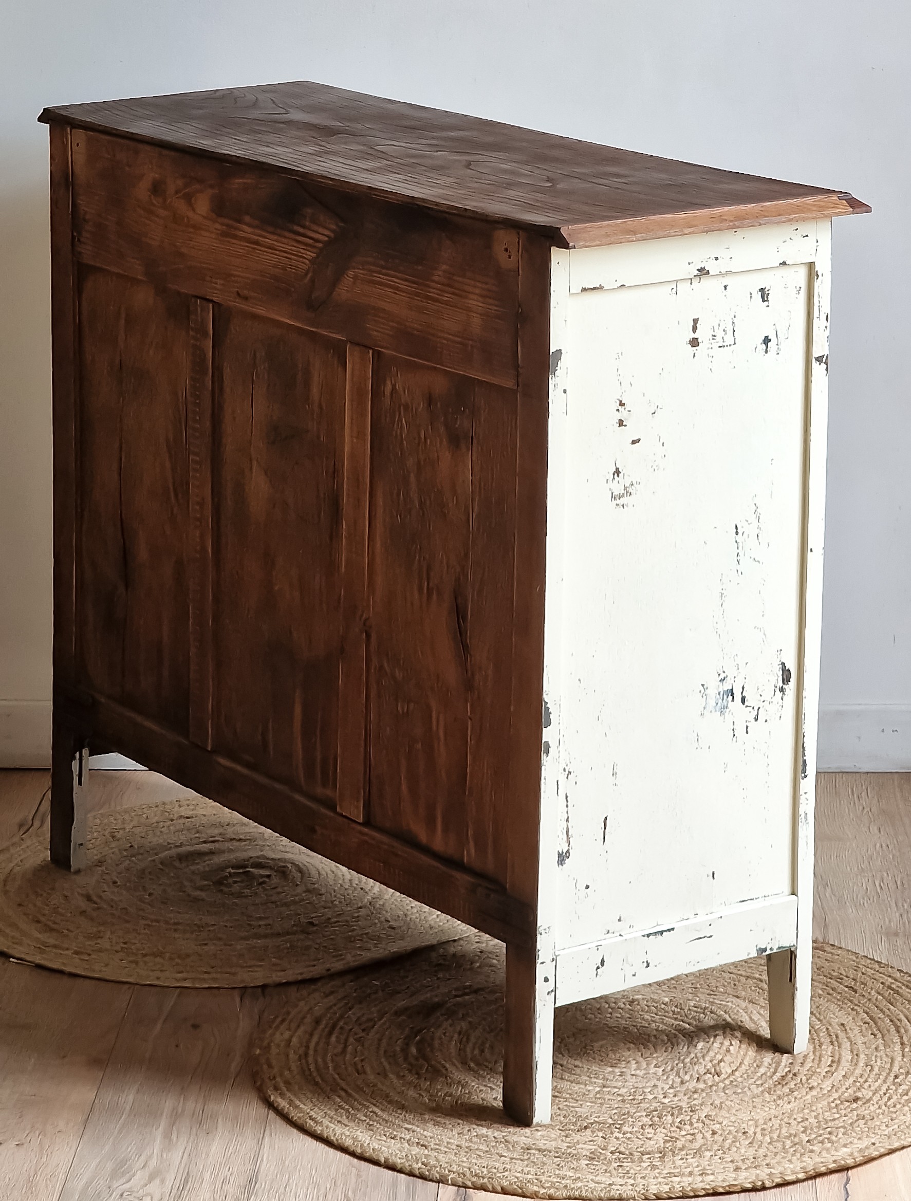 Ses éclats passés, ses cicatrices assumées Ce buffet patiné au charme brut incarne l’esprit wasi-sabi : l'élégance des choses simples, le raffinement du vécu, la sérénité du rustique.