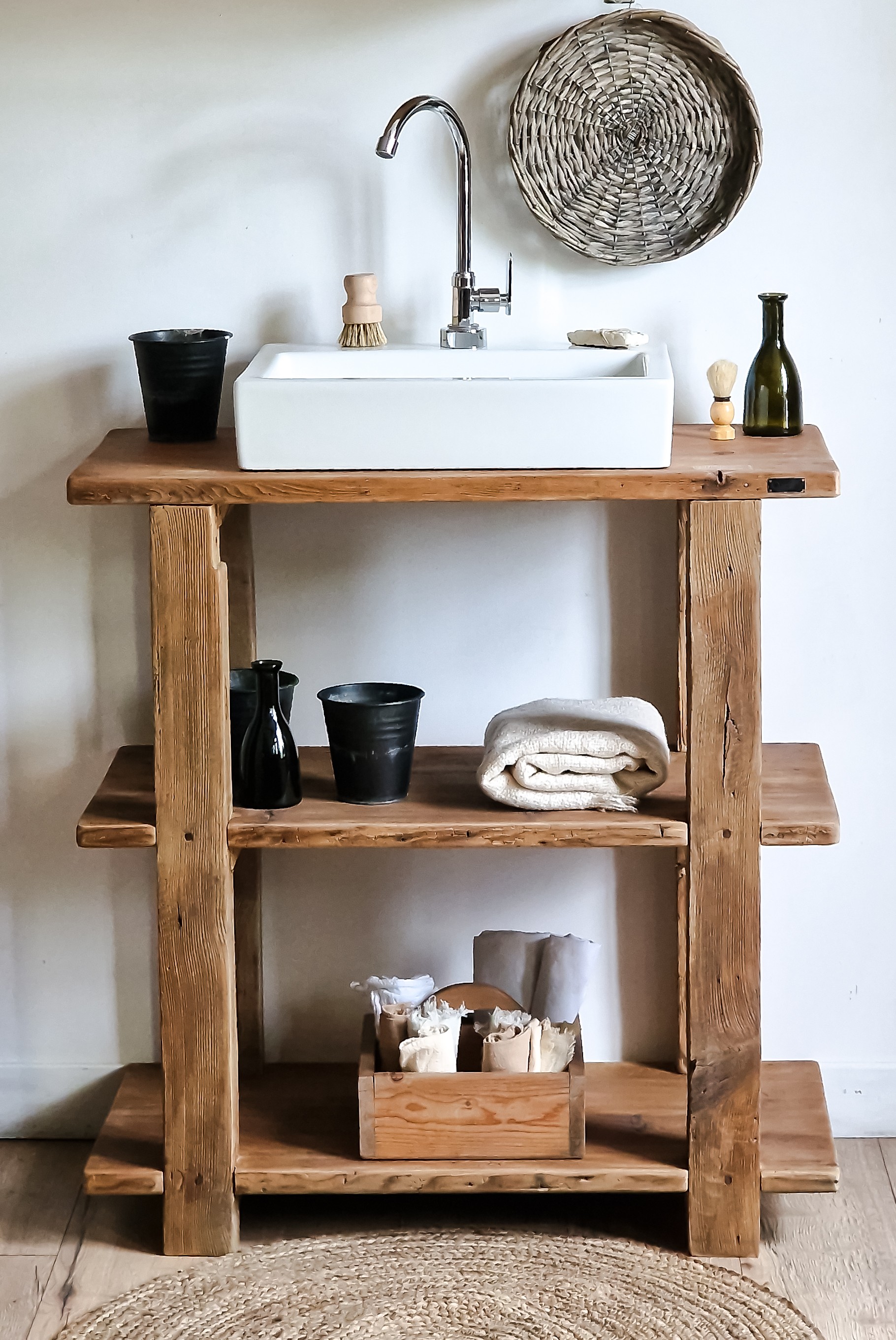 Fabriquée à la main, elle se transforme en meuble vasque ou en console de charme, selon vos envies. Bois massif, lignes simples, esprit wabi-sabi… chaque détail respire la sérénité.