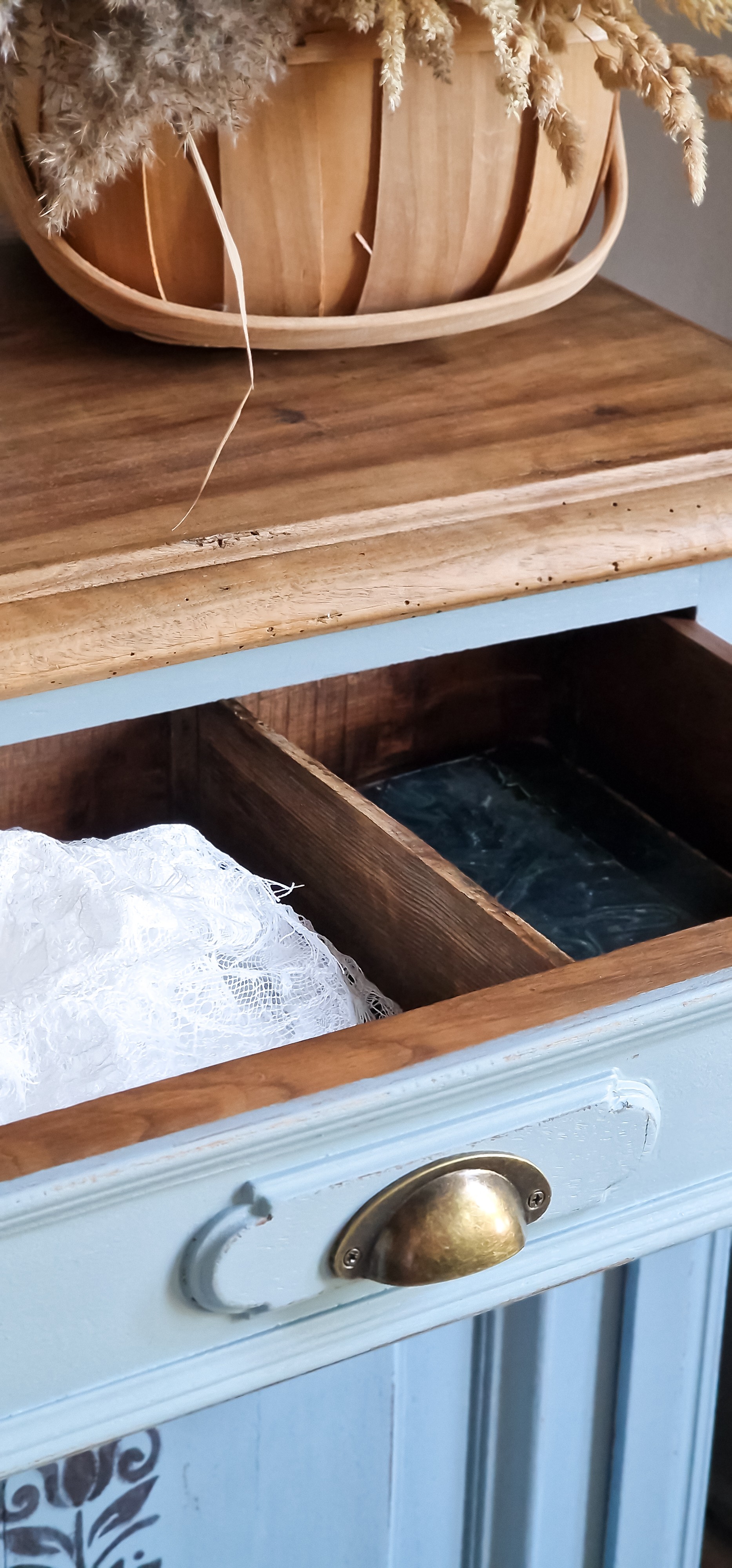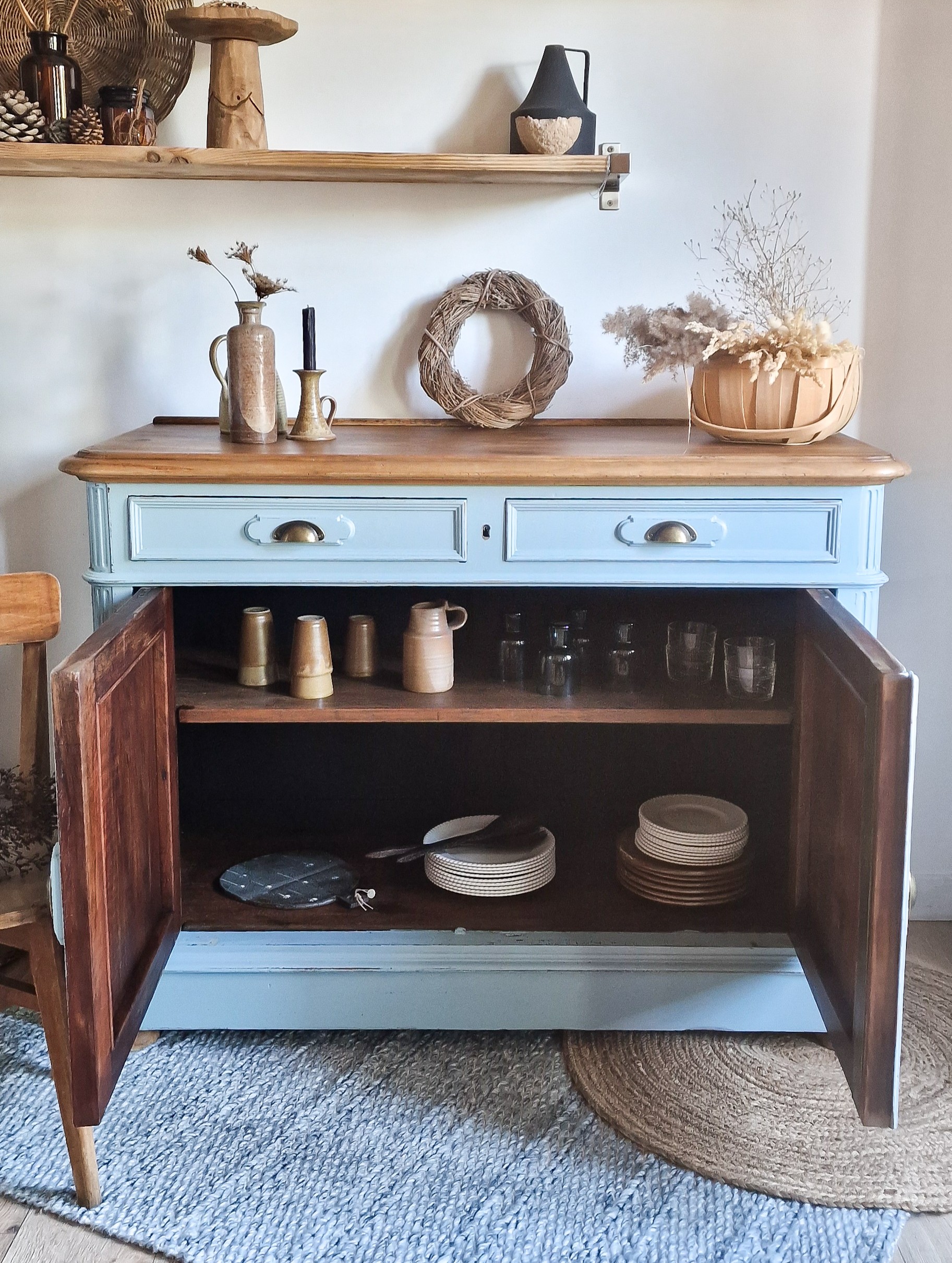 Longtemps témoin de repas et de conversations animées, il avait perdu un peu de son éclat. Alors, il a été réparé, nettoyé, poncé avec soin, avant de recevoir une nouvelle peau : un bleu grisé doux et apaisant, une patine usée façon meuble de famille.