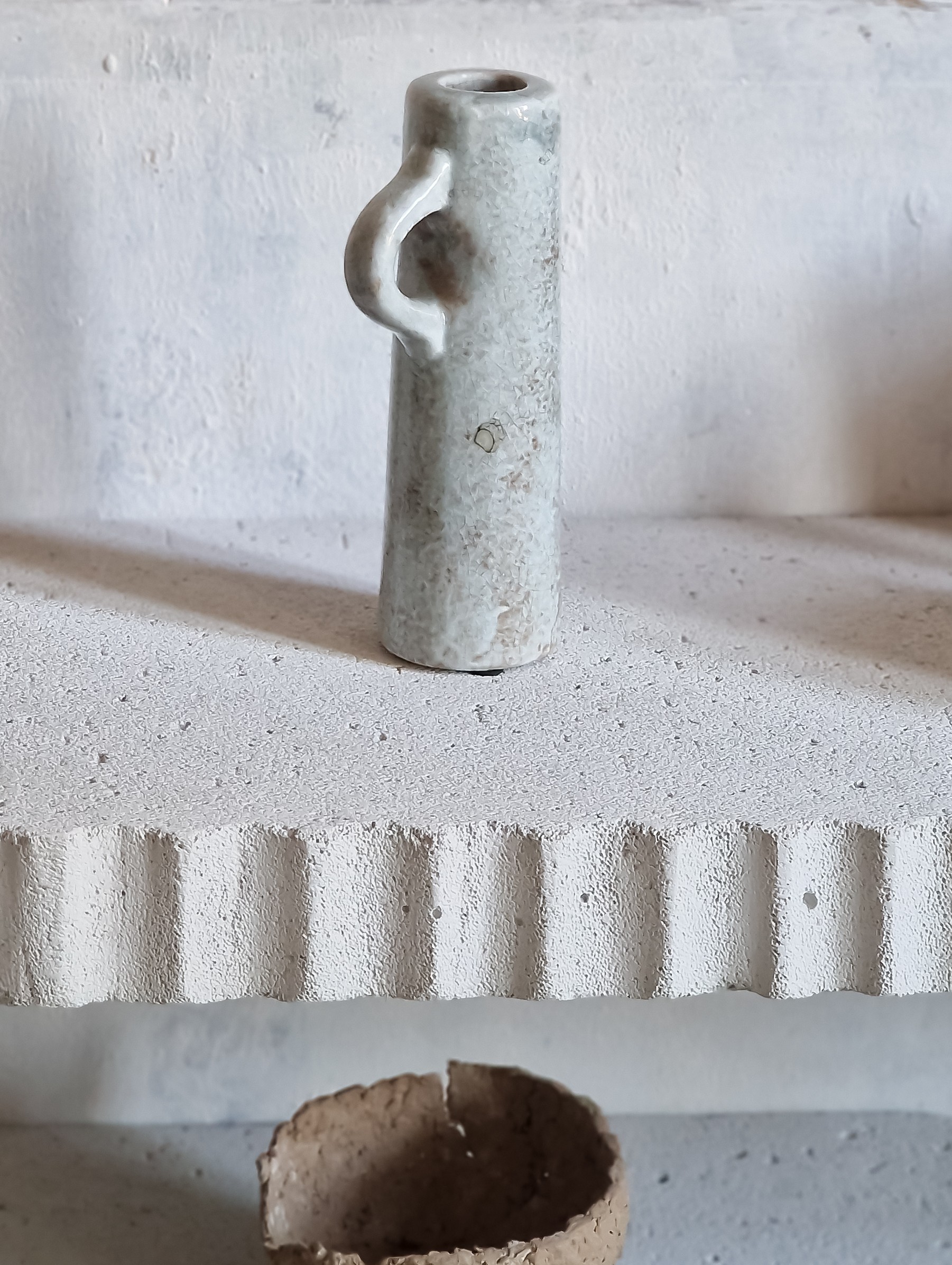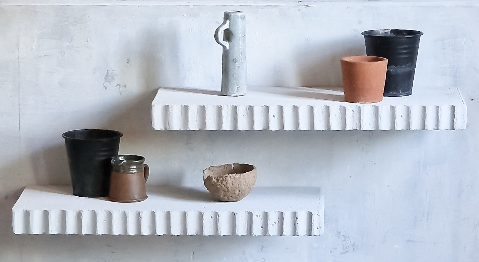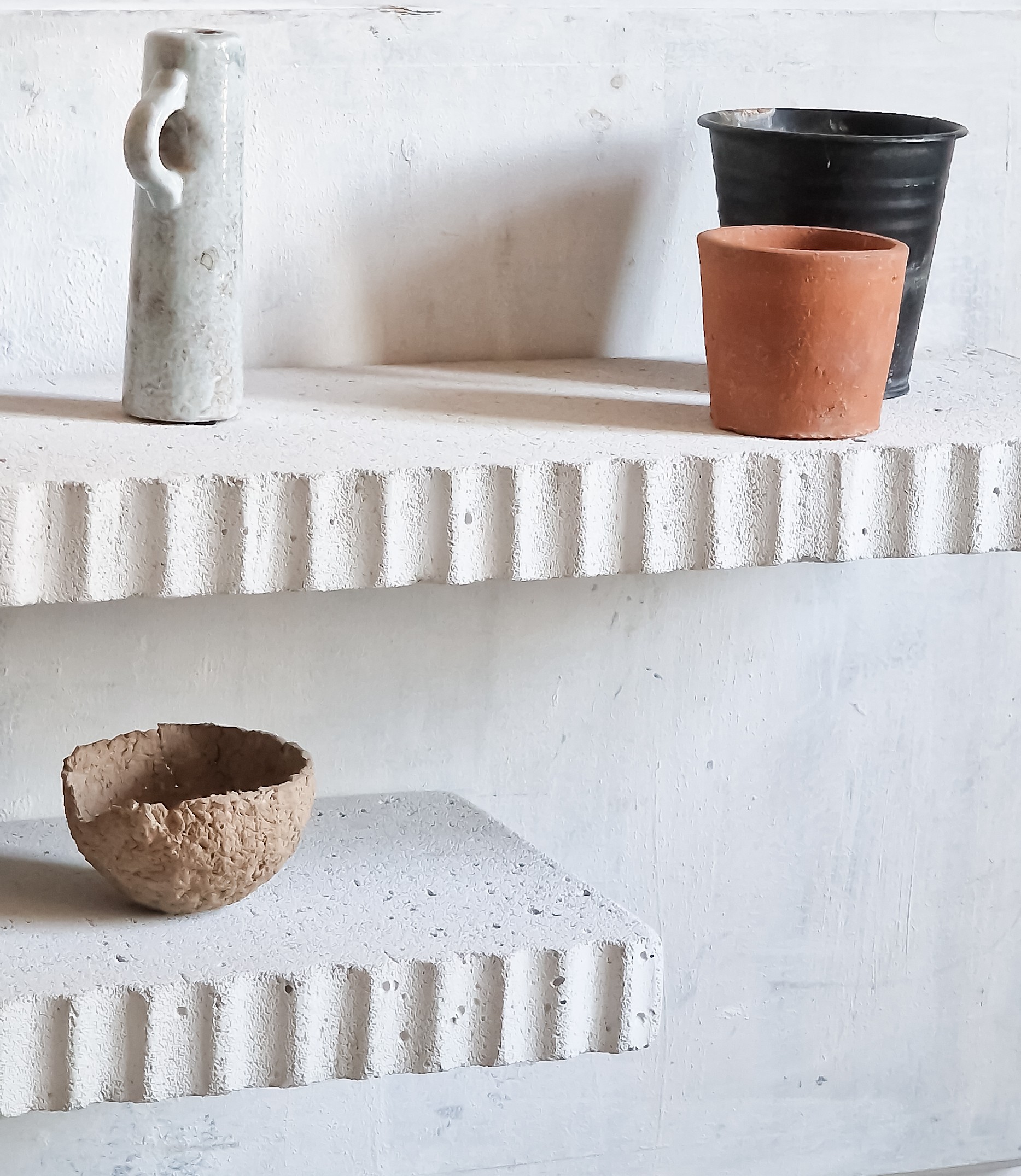 Béton blanc sculpté à la main, lignes texturées, fixations invisibles : la simplicité brute sublimée par le style bohème chic et wabi-sabi.