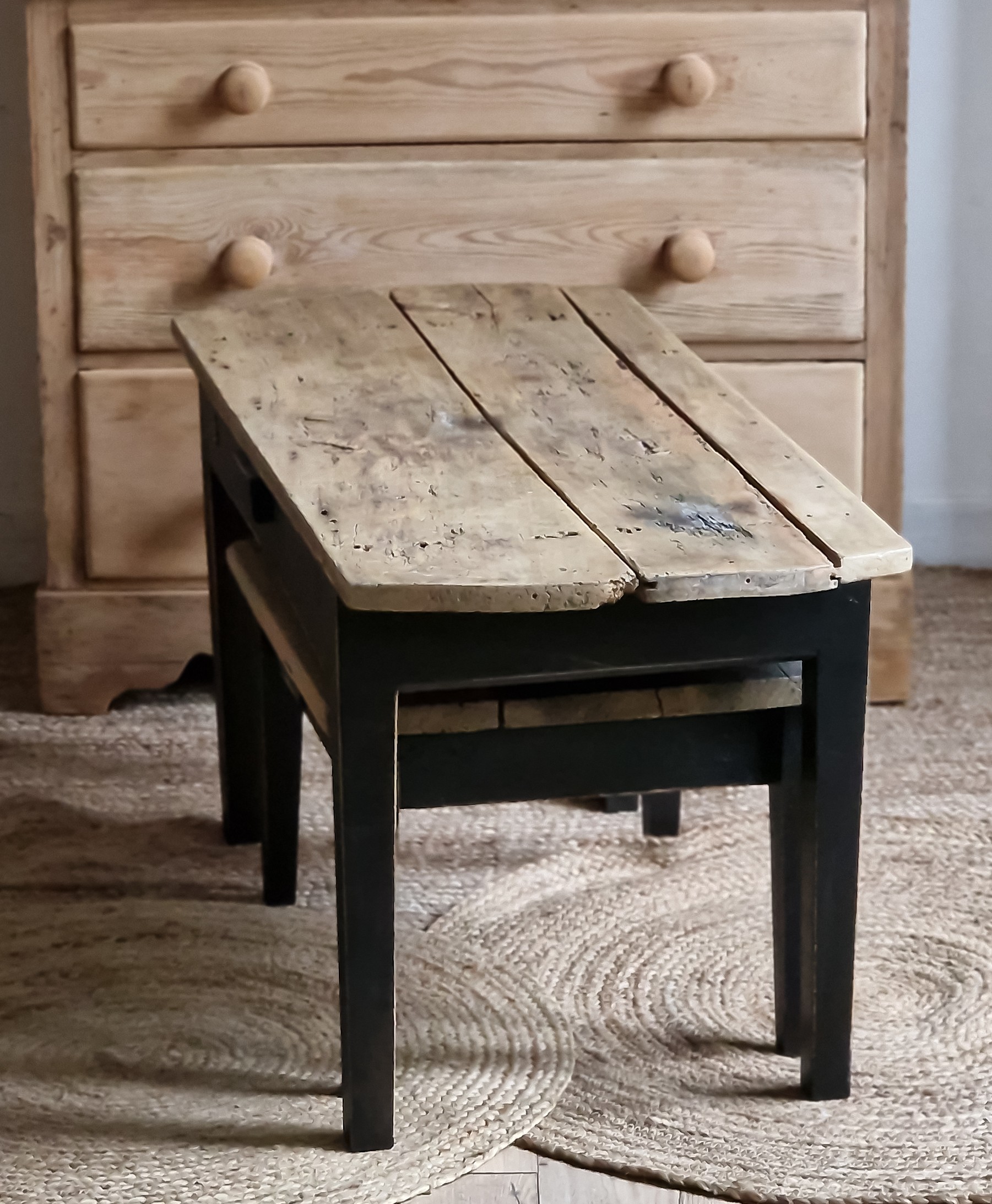 Piètement peint en noir mat usé