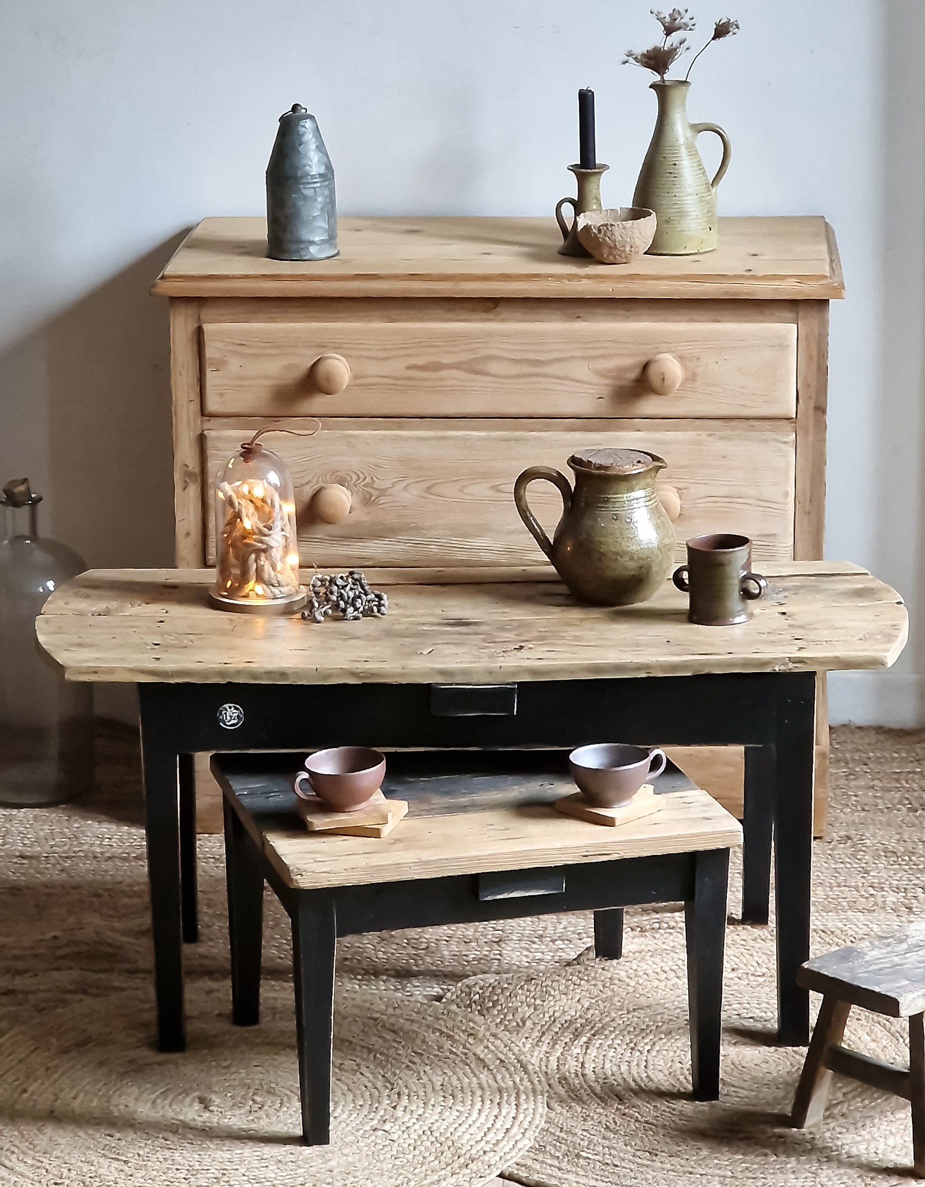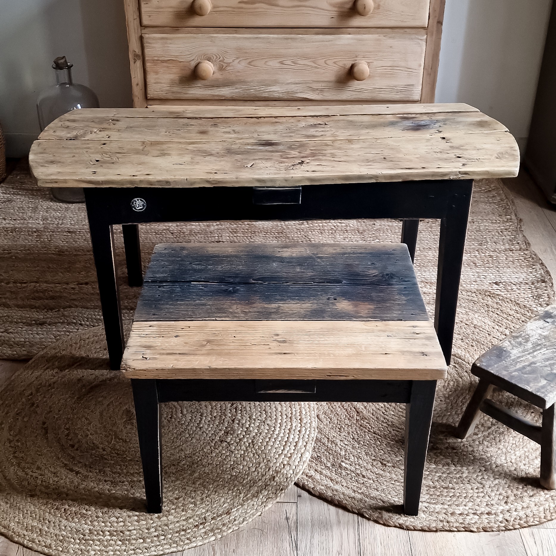 Deux tables basses, anciennes compagnes de maison, qui ont vu passer des saisons entières.