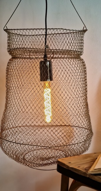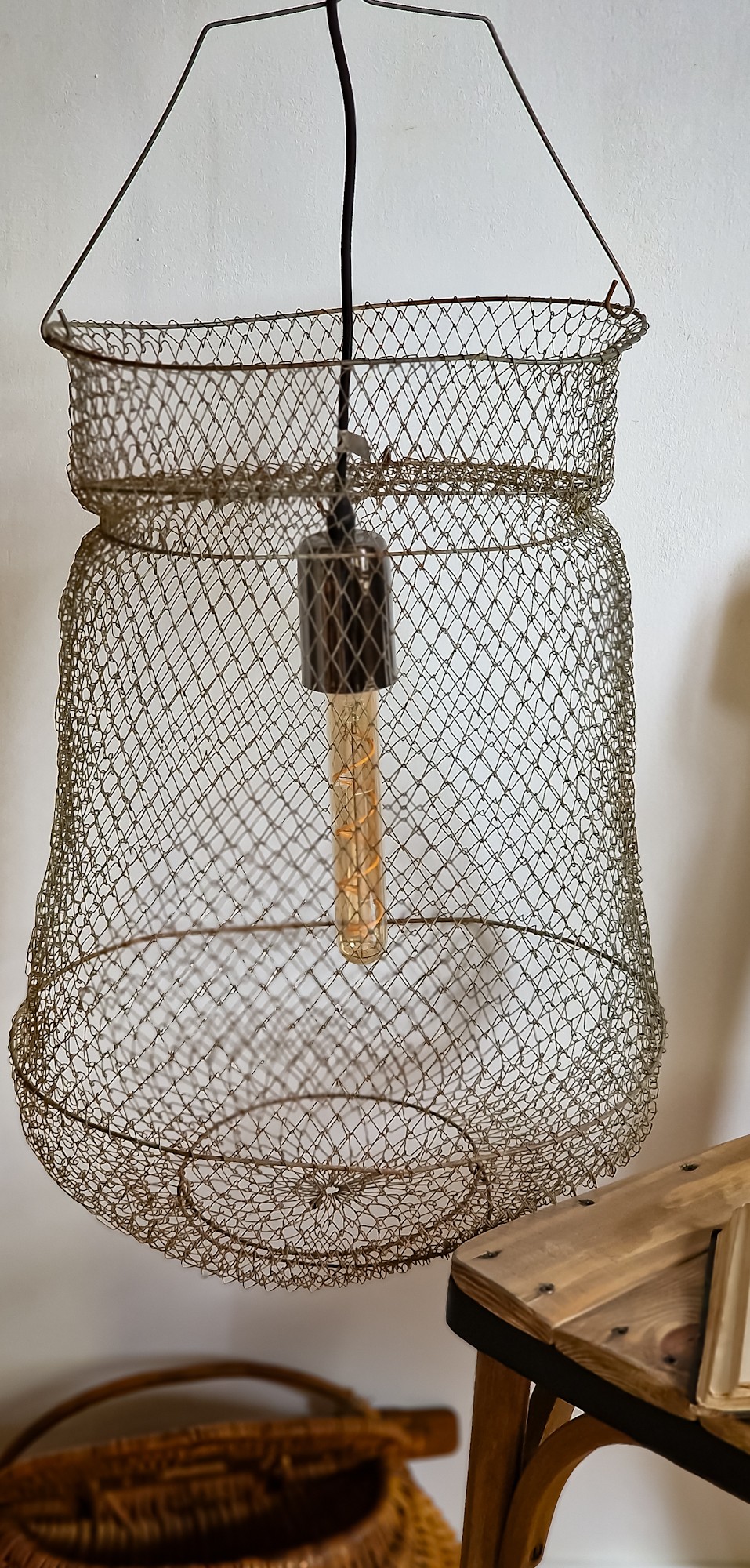 Réalisée à partir d’un grand panier de pêche détourné, elle diffuse une lumière douce et chaleureuse, avec ce charme brut des objets d’autrefois.