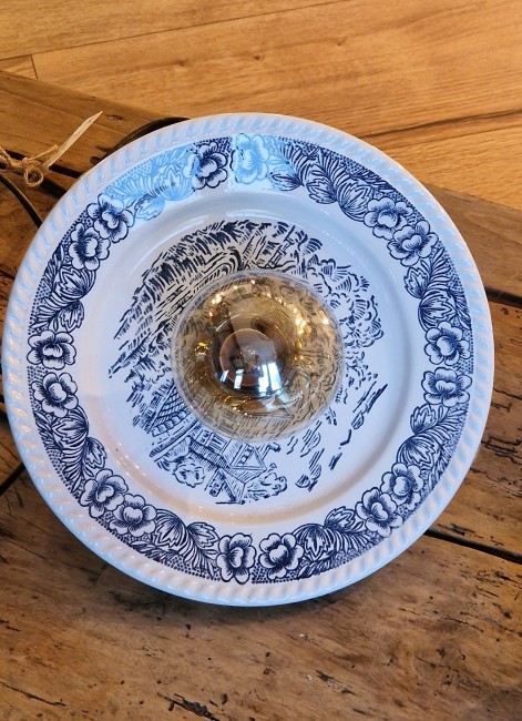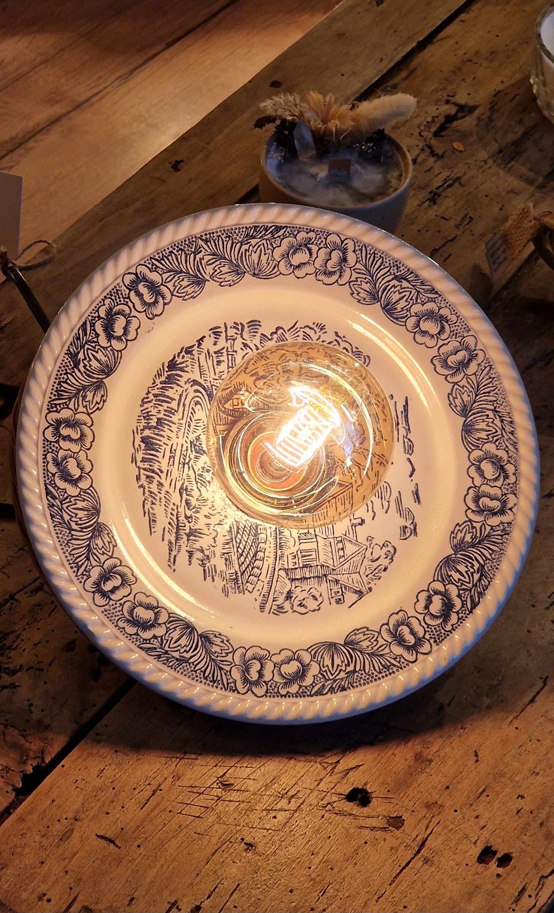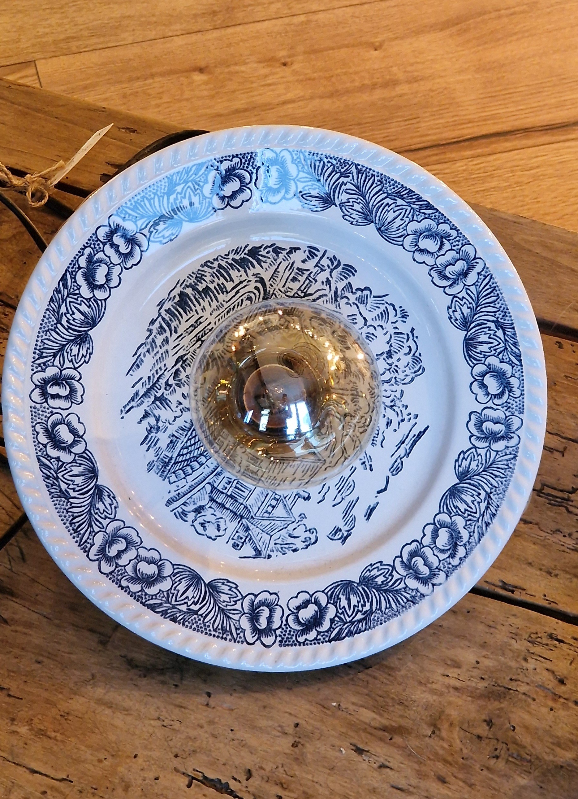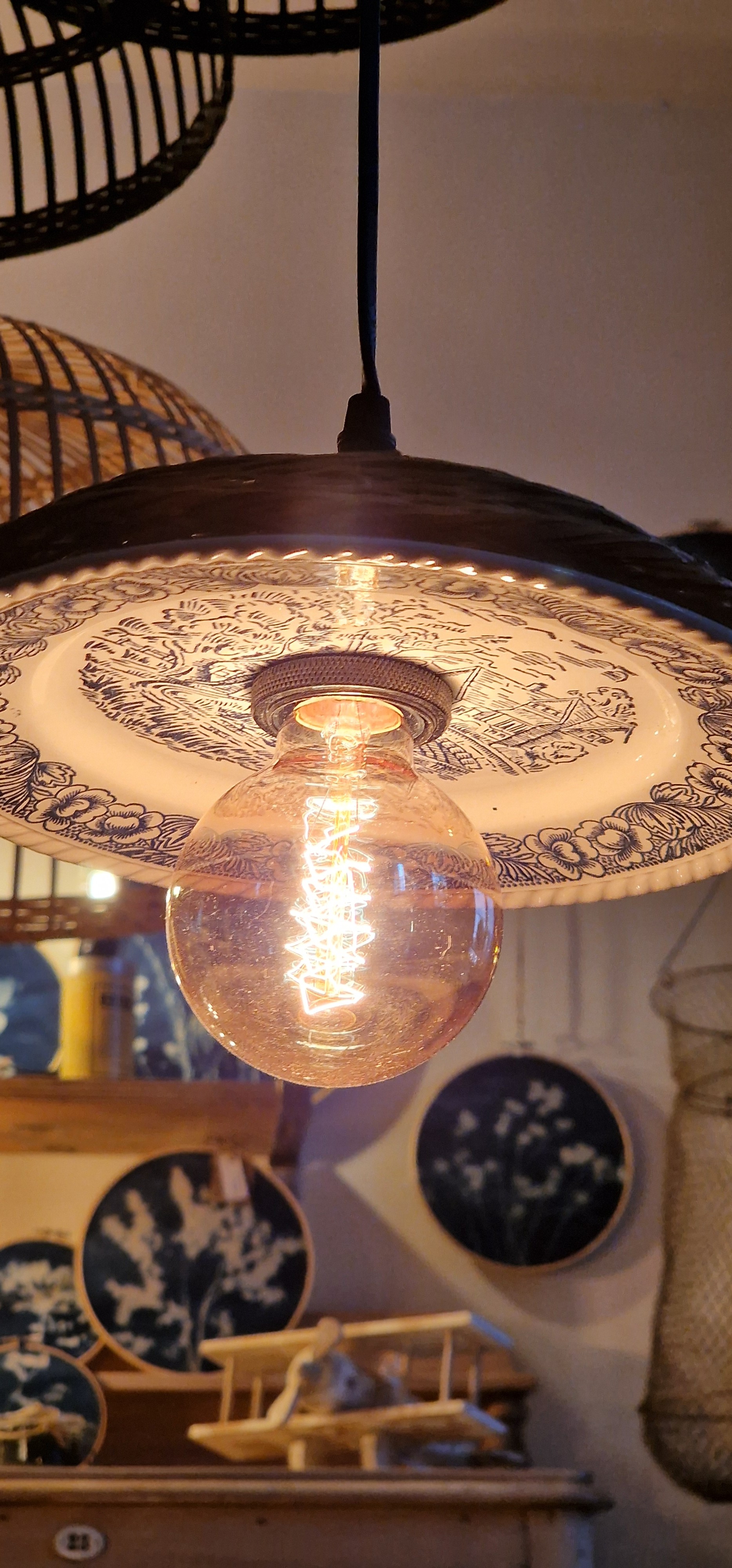 Lampe unique née de la rencontre entre un panier plat tressé et une assiette ancienne au décor bleu.