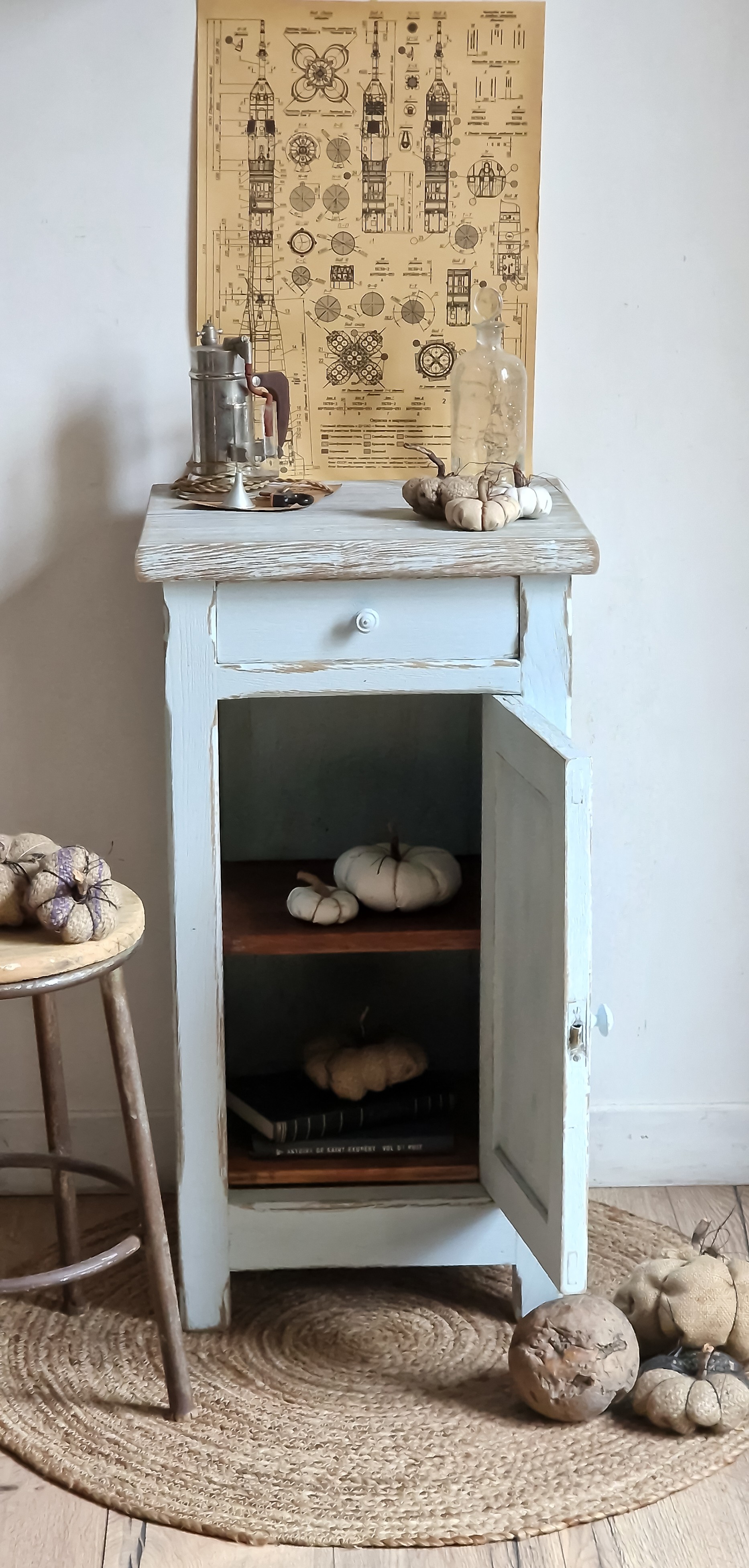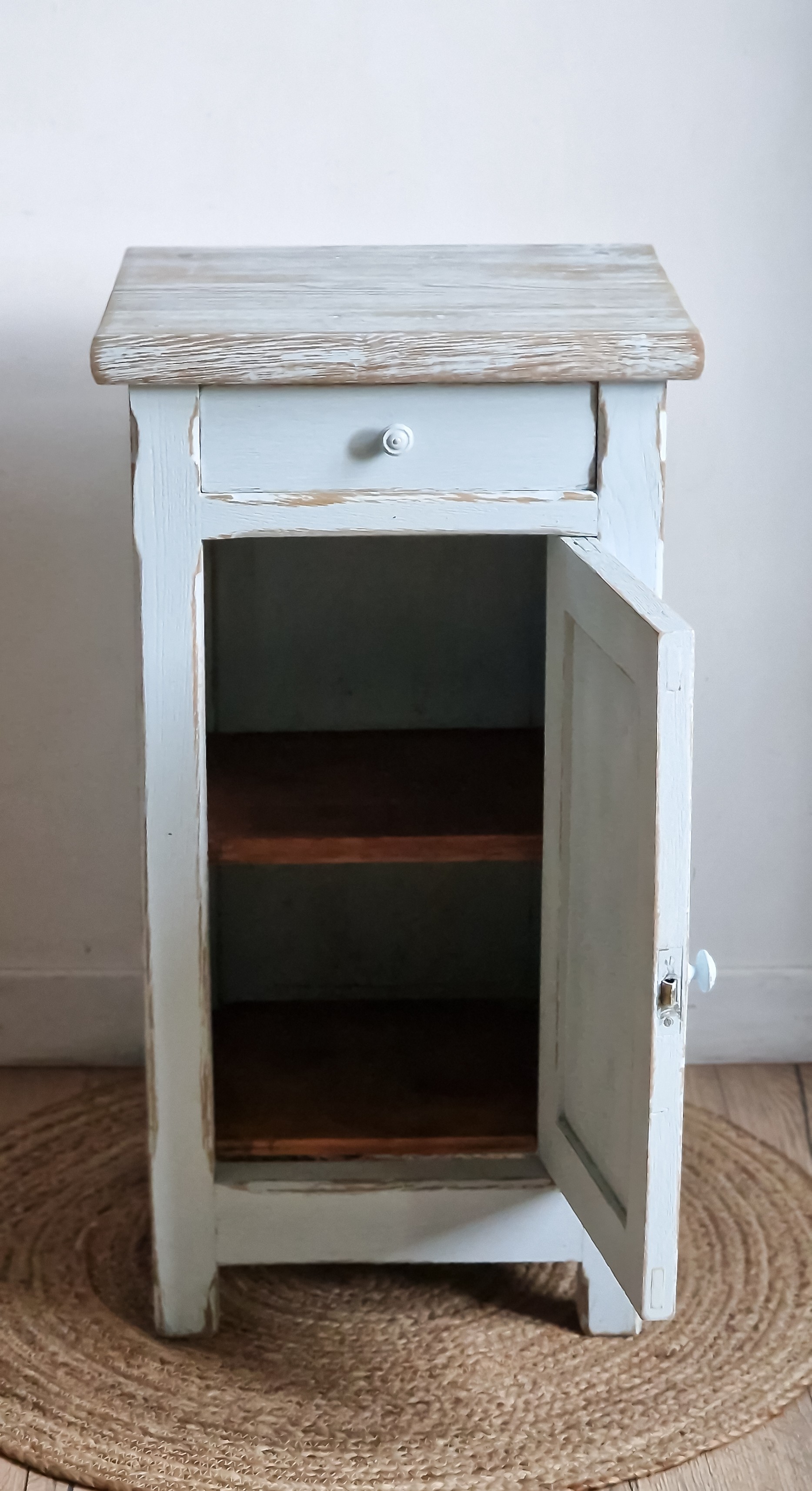 Restauré en respectant ce qu’il était déjà : son bleu grisé poudré, sa patine subtile, son plateau brossé comme vieilli par le temps. Rien n’a été lissé : chaque trace raconte quelque chose.