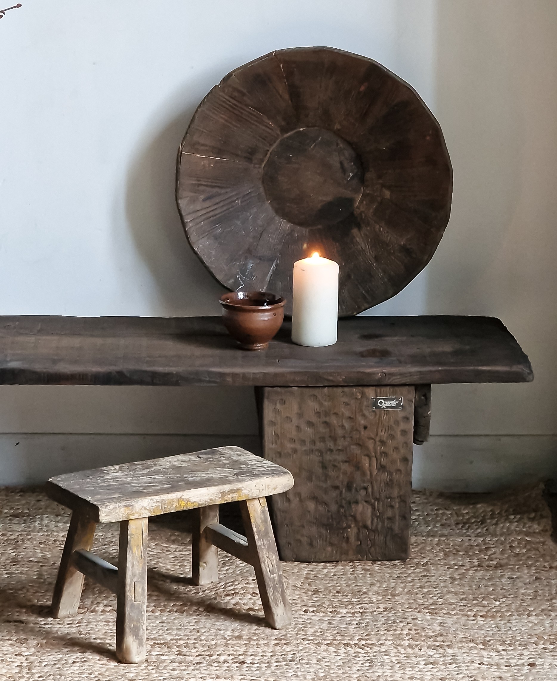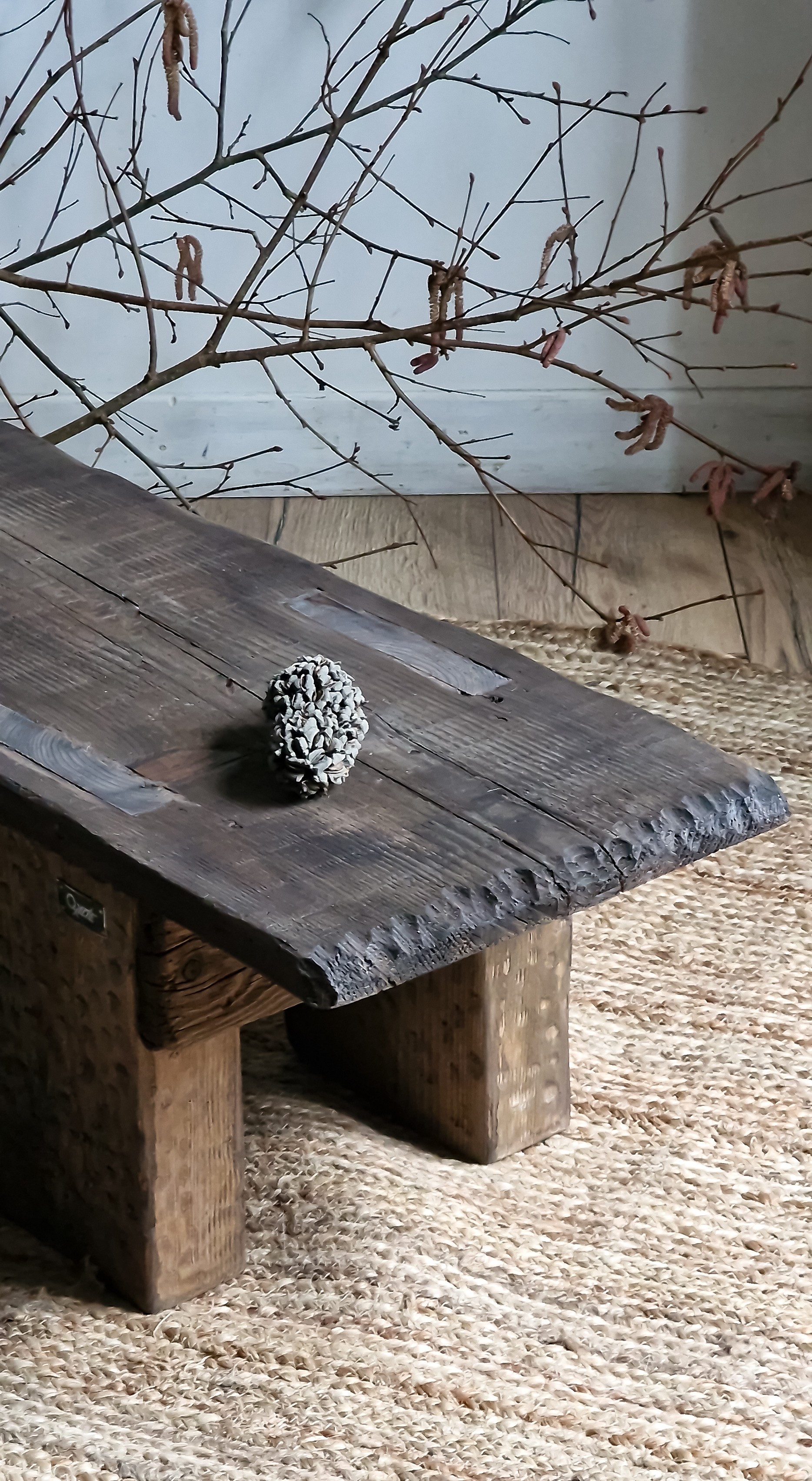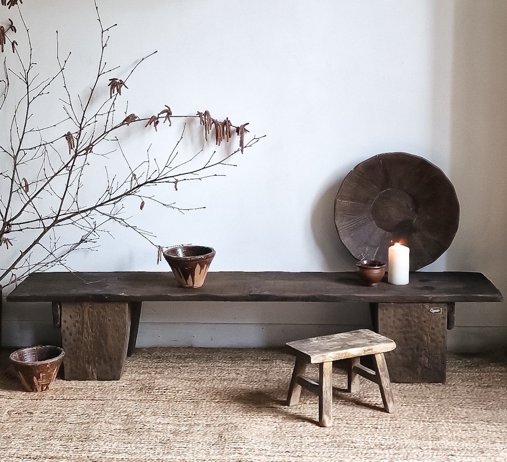Console dans l’entrée, banc au pied du lit, table basse allongée dans le salon — le bois ancien s’adapte simplement, grâce à sa silhouette longue et ses bords irréguliers.
