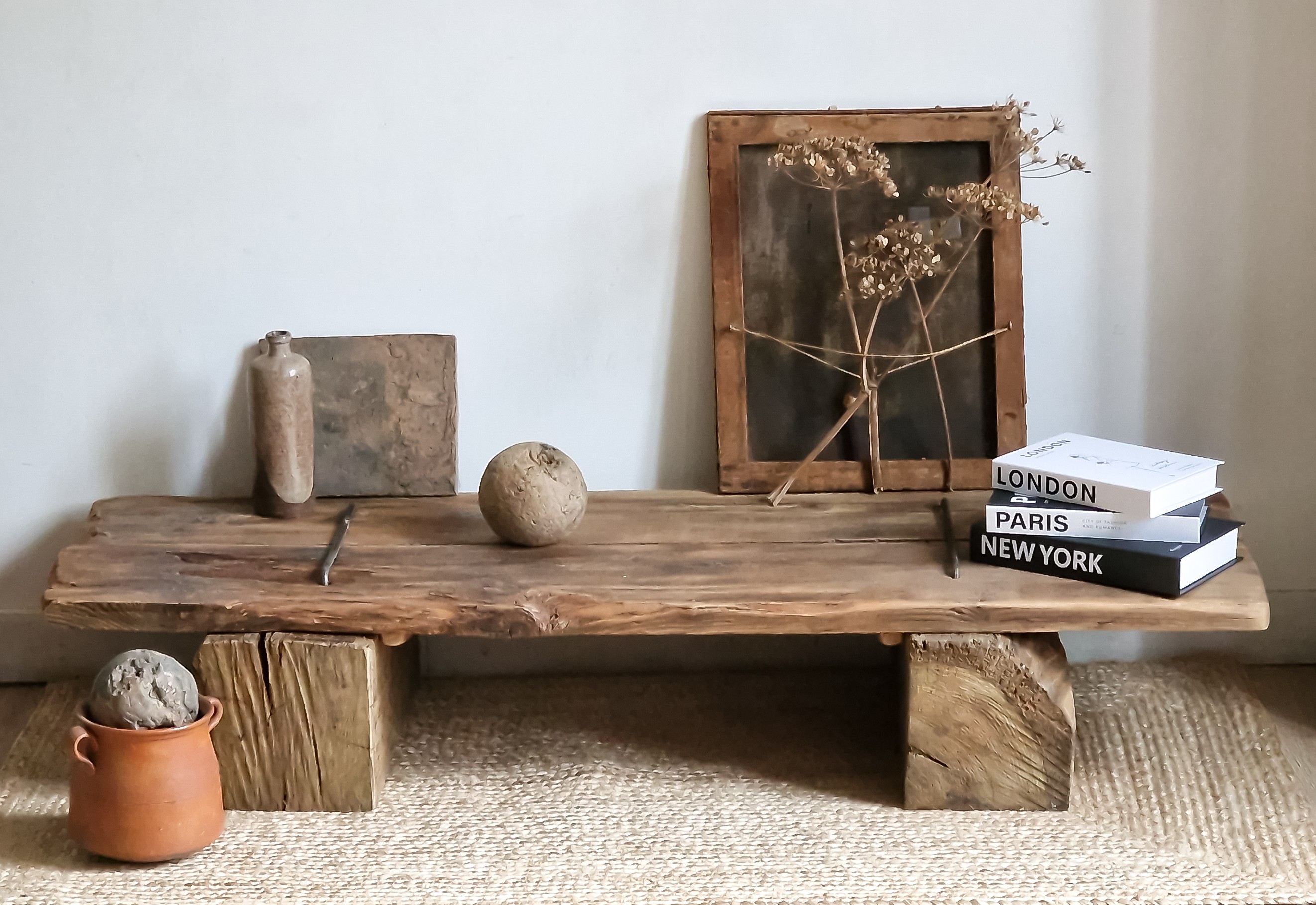 Les pieds, à partir de poutres en chêne massif, portent cette assise avec gravité. Dans son aspect brut et sobre, cette table basse invite au calme, à la simplicité silencieuse. Esprit wabi-sabi, elle accueille l’imperfection en partageant l’âme du bois véritable.