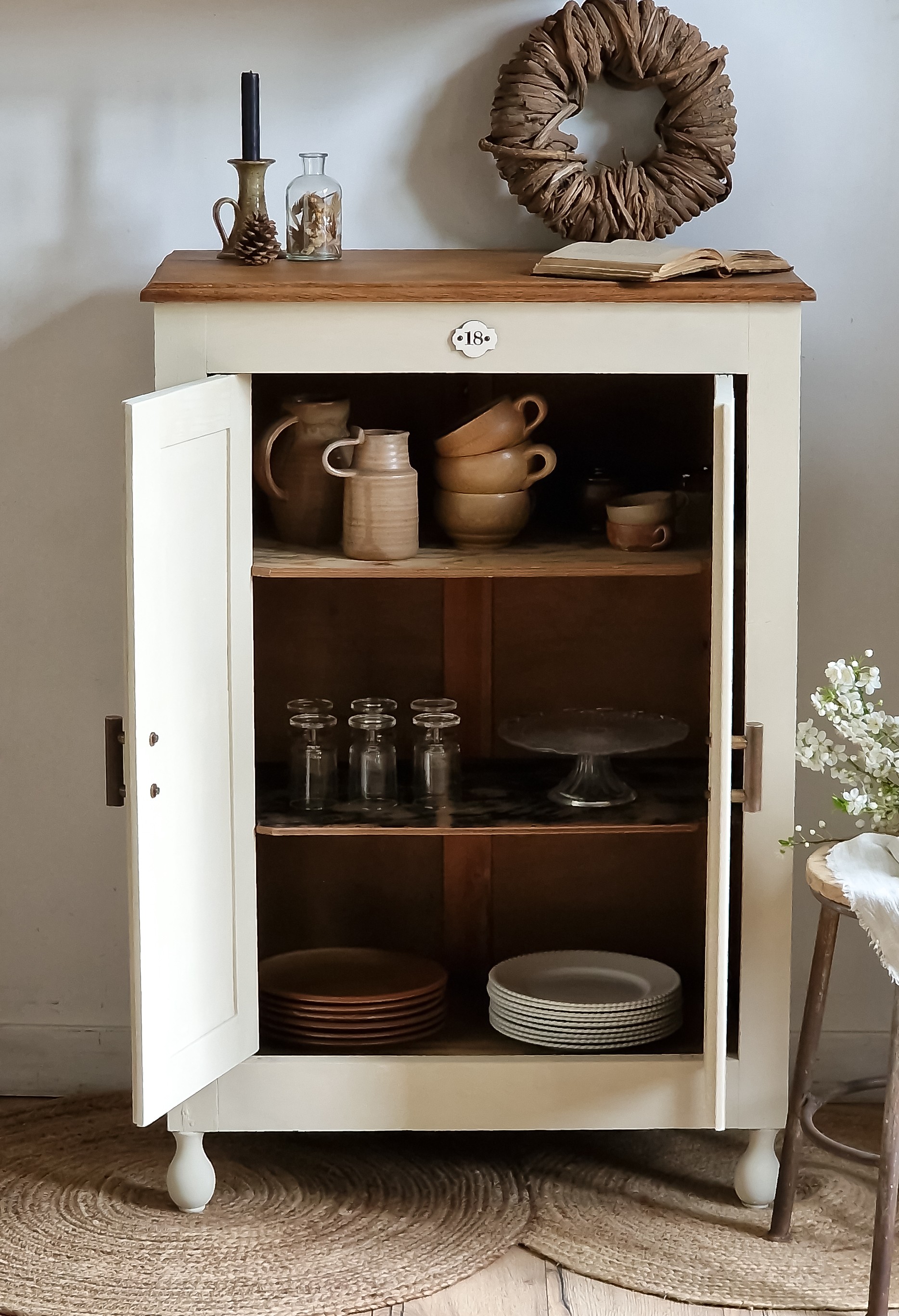 Son plateau en chêne naturel protégé a été retravaillé et protégé pour un usage quotidien. Les poignées en métal patiné et la plaque numérotée “18” soulignent son caractère ancien. À l’intérieur, deux étagères offrent un rangement fonctionnel pour vaisselle, linge de maison ou décoration.